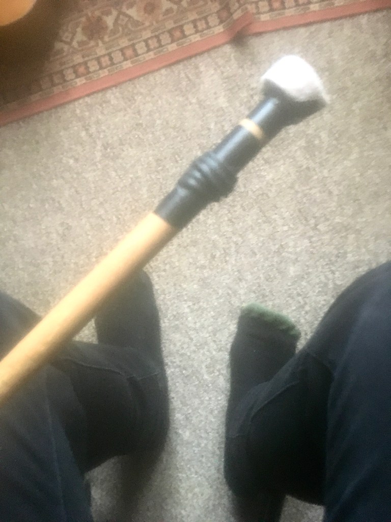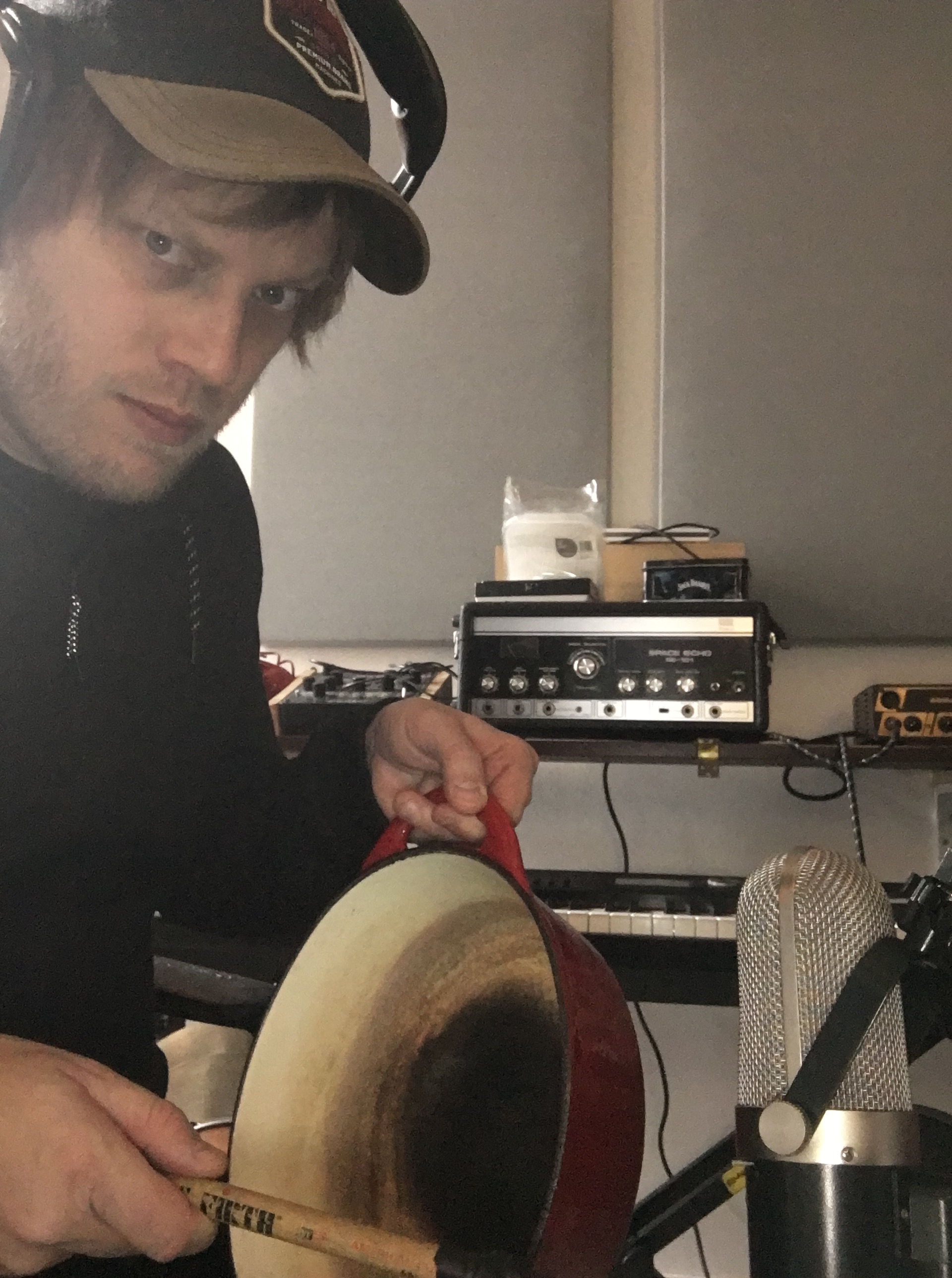 A few miles away in Kings Heath, I suspect similar things are happening… Michael sent me a photo this morning of him in his studio, with headphones, and casserole dish, and drumstick with adaptations… he has been playing, and improvising, because I had said I thought a bell would be a good idea for one of the songs. While I am listening and mucking about with the words and the singing, he’s walking round his house, bashing stuff with a stick. He has taken on my concepts and ideas and is diving in too. Love it!