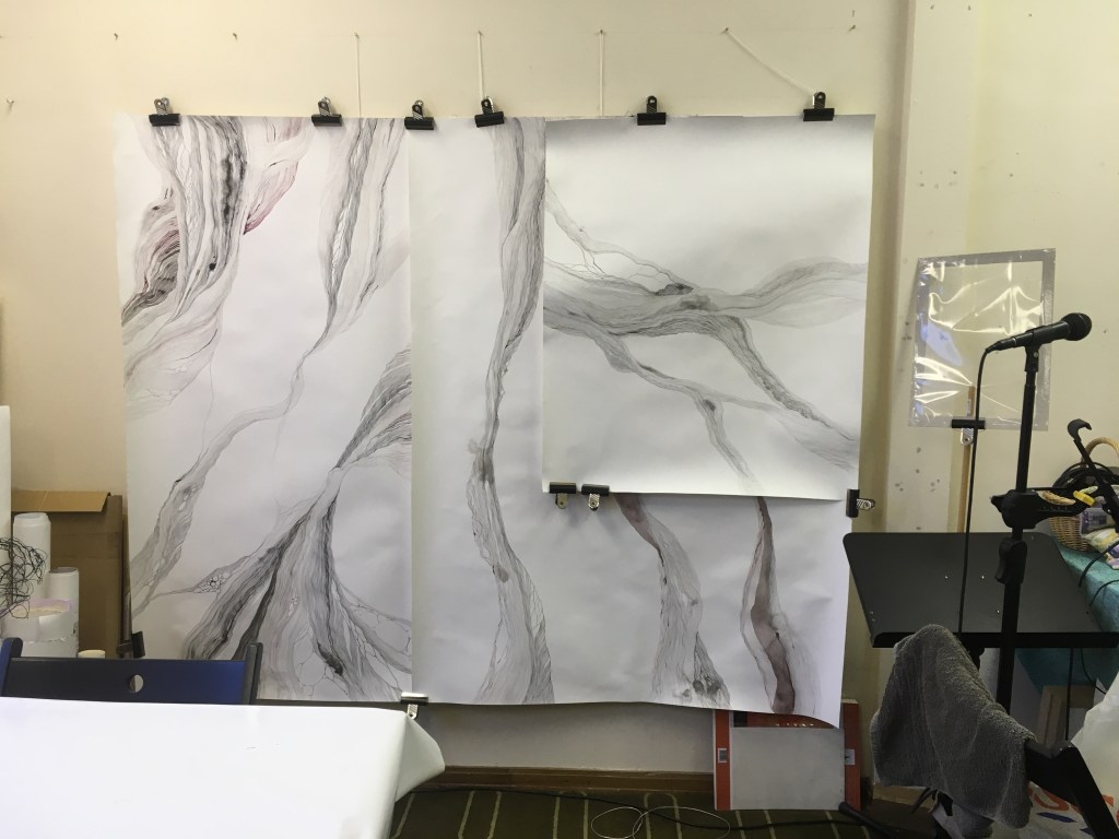 My job, as the artist, is to make it work. One piece in particular has brought me to this. I can’t play it to you yet, but it is called Undertaker Bees and it has a jagged, percussive piece of piano (written and played by Michael Clarke) that fits the lyric perfectly, and in itself has informed several bits of drawing. (Having itself been inspired by the recordings of a charcoal drawing) Of course, as a solo piece among gentleness and recordings of ambient sounds, it’s like being hit by a sledgehammer. It is my job, Laura, to decide whether being hit by this sledgehammer is what this song should do, or whether it should sneak up on us slowly before we realise what it is.