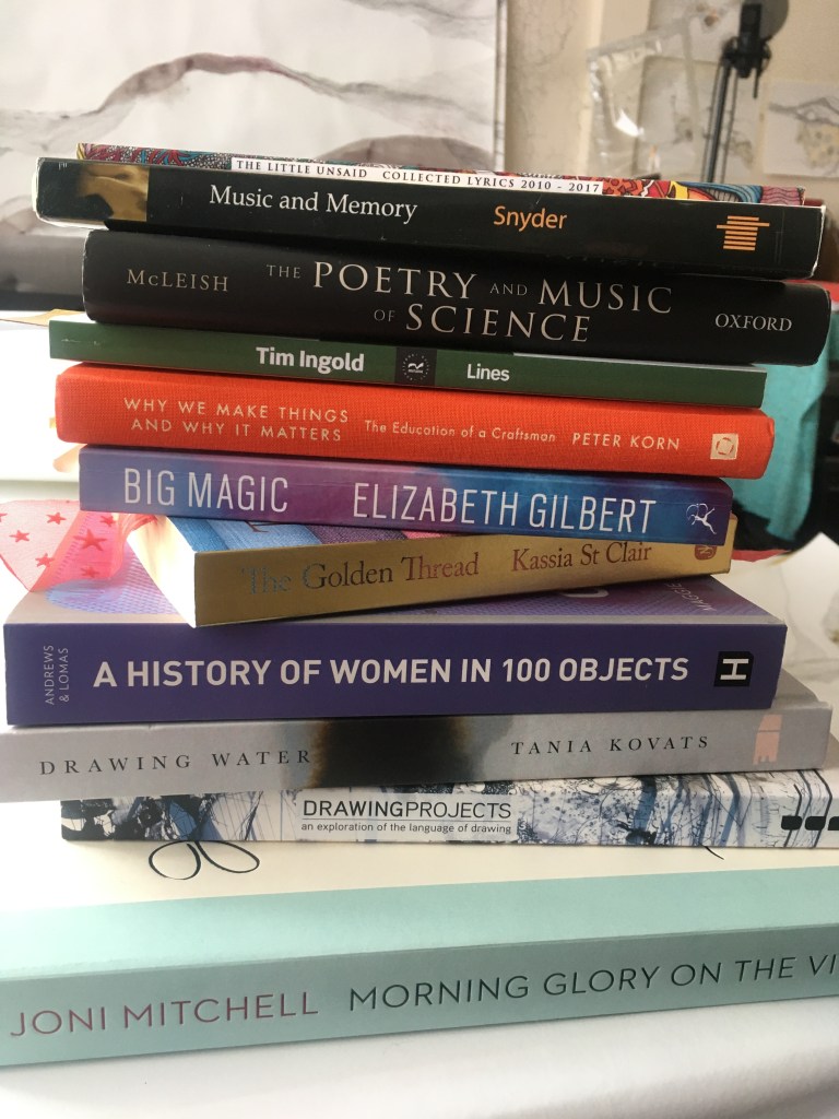 So, in hope, I have this pile by my studio table. I’m just about to have a big Tidy-Up in order that they are more accessible. You’ll notice most of them have bits of ribbon/paper/post its as markers of where I’ve got to, or points of interest, but maybe only two of them are “finished”.