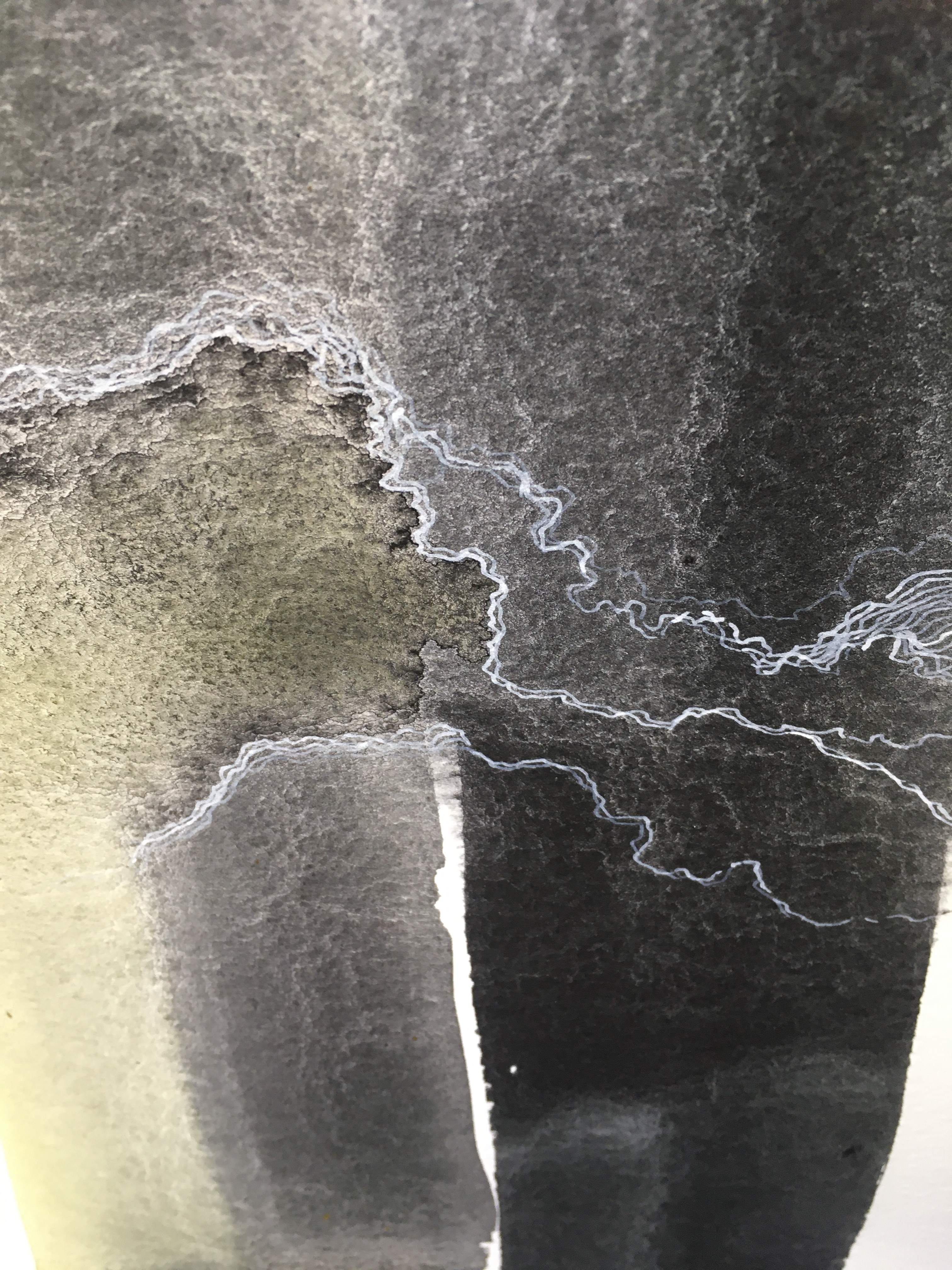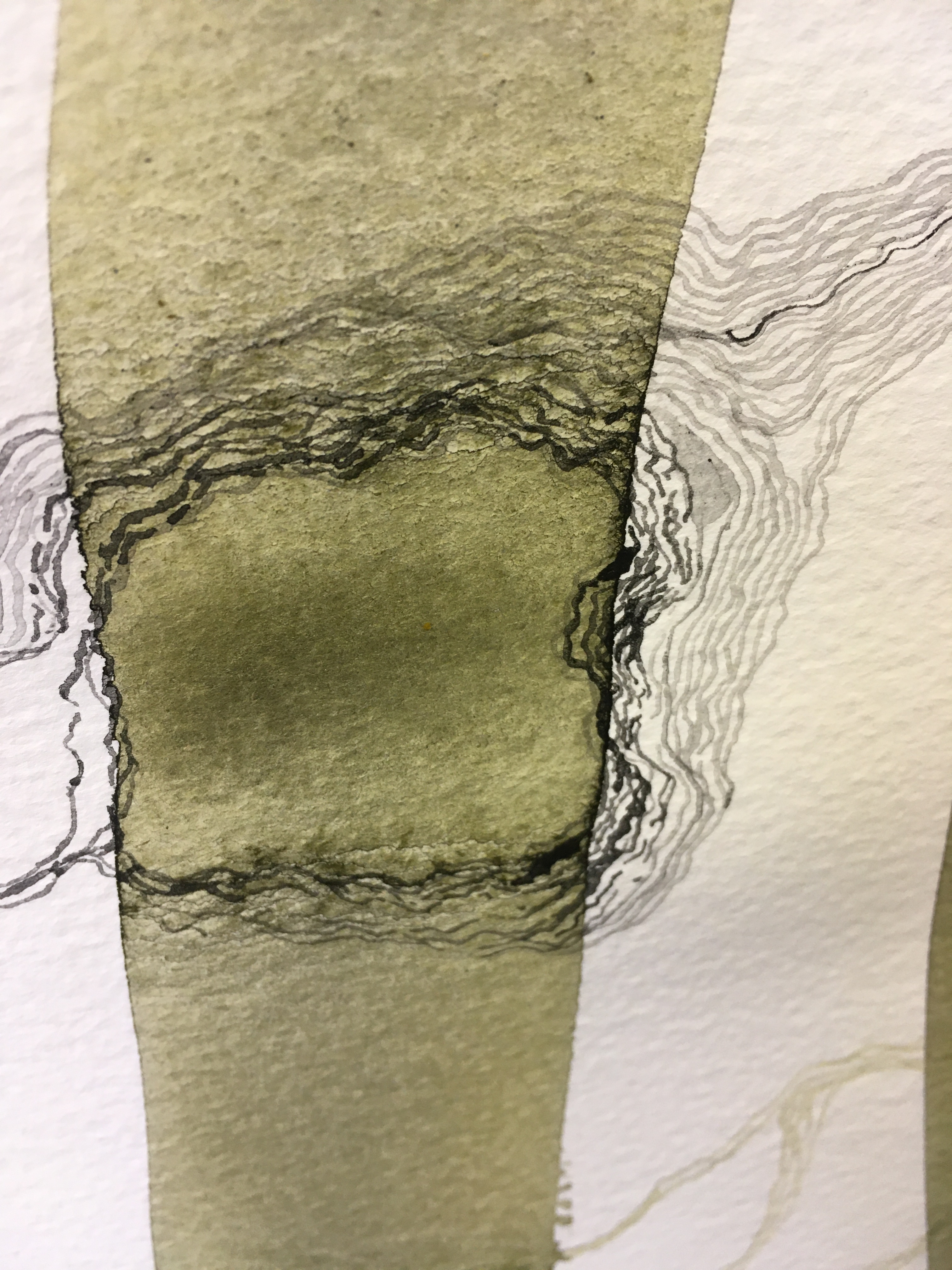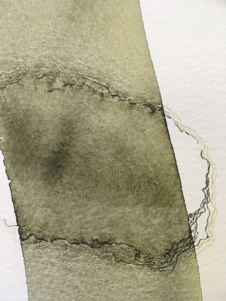 I’m saying it because it is having an effect on the way that I’m working. Unrolling the large paper is difficult and painful, so I have ordered some large flat sheets instead. It’s also having an effect on the colours I’m choosing. In the last couple of weeks I’ve moved away from the soft and smooth Payne’s grey watercolour. Instead I’ve been using ink not just to do the drawing but to lay down some initial colours too. I’m using leftovers (hate wasting materials) so the ink is smelly and bitty and grainy. It feels appropriate. The gritty bits feel like the bit of floating debris in my joints. I draw around them, draw attention to them. The colours feel right too. Yellow ochre mixed with black to give varying tones from the sharp but dirty yellow through a sickening green to grey and black. Today I have a selection of jars filled with dilutions of carmine and black. The colours feel sore and inflamed. Bruises. Today I am using large brushes to sweep these branches of colours over wet paper, then half dry, then completely dry… my painkillers kick in as the paper undulates, then starts to dry and straighten out. In about twenty minutes I will be able to hold the slender pen to dip the nib and draw some lines and marks…