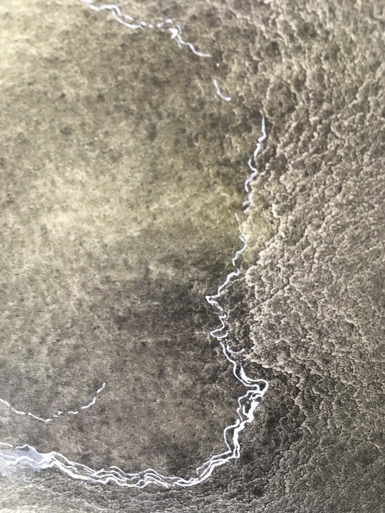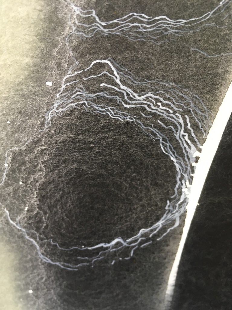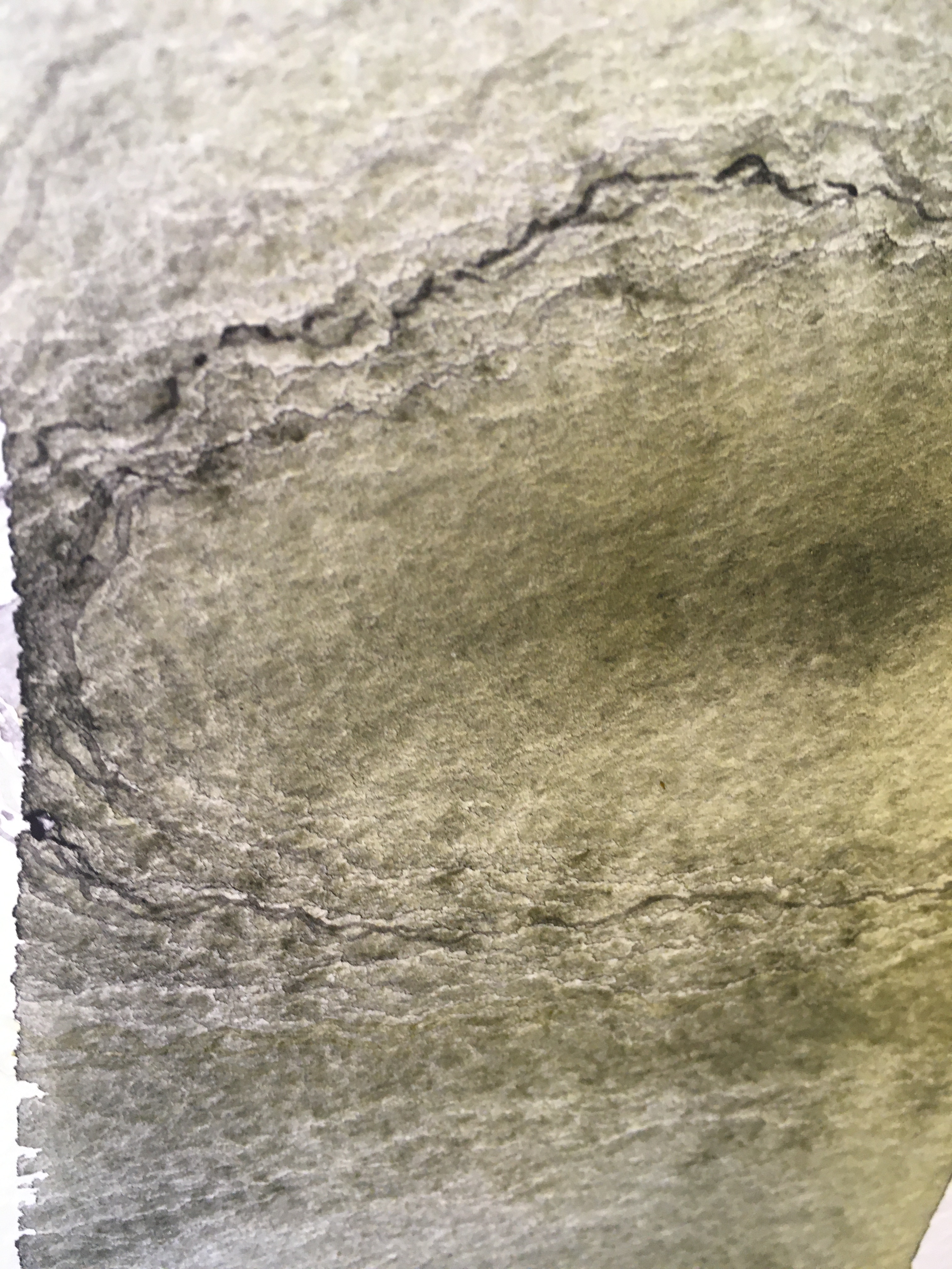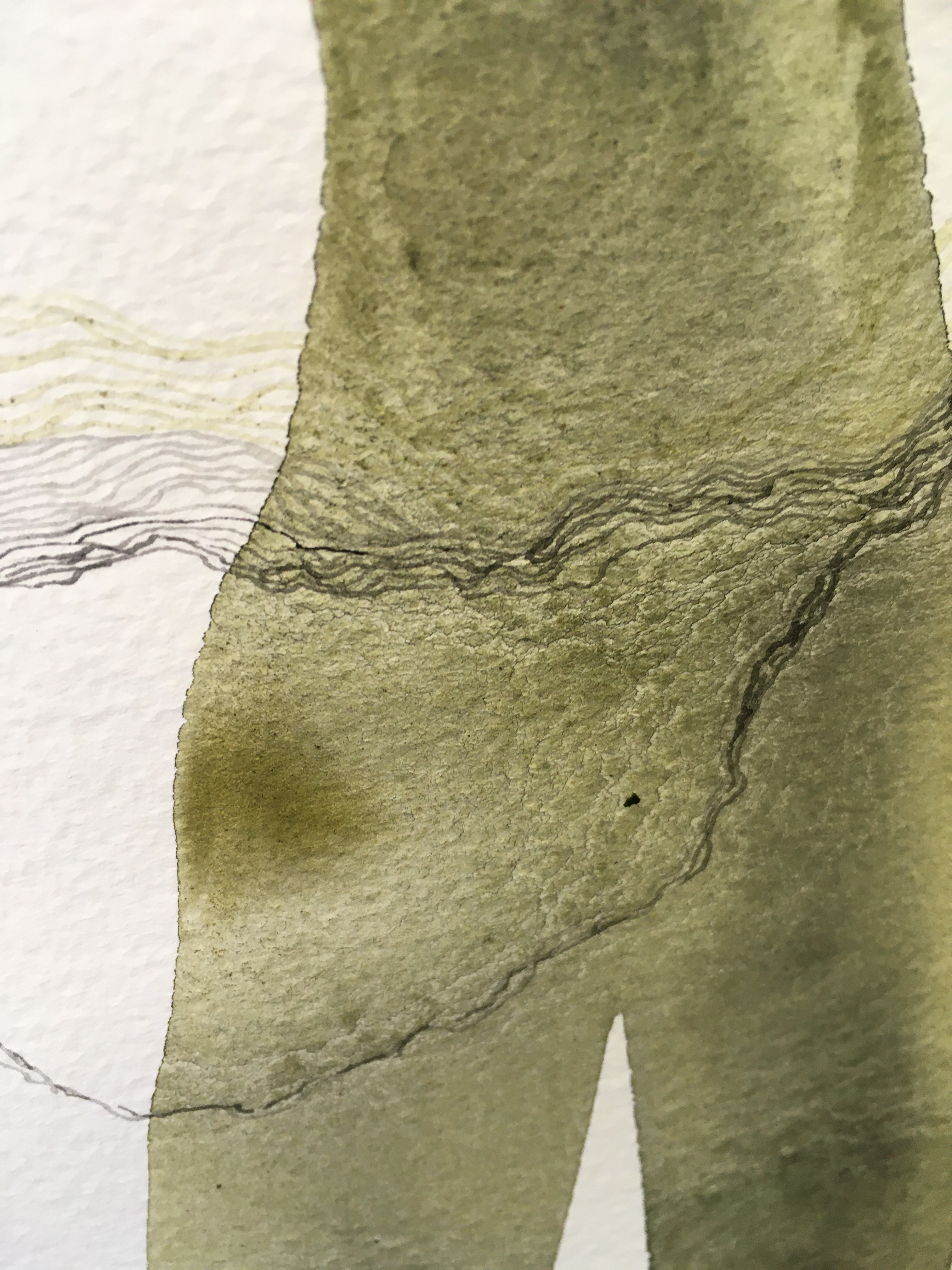 I’m saying it because it is having an effect on the way that I’m working. Unrolling the large paper is difficult and painful, so I have ordered some large flat sheets instead. It’s also having an effect on the colours I’m choosing. In the last couple of weeks I’ve moved away from the soft and smooth Payne’s grey watercolour. Instead I’ve been using ink not just to do the drawing but to lay down some initial colours too. I’m using leftovers (hate wasting materials) so the ink is smelly and bitty and grainy. It feels appropriate. The gritty bits feel like the bit of floating debris in my joints. I draw around them, draw attention to them. The colours feel right too. Yellow ochre mixed with black to give varying tones from the sharp but dirty yellow through a sickening green to grey and black. Today I have a selection of jars filled with dilutions of carmine and black. The colours feel sore and inflamed. Bruises. Today I am using large brushes to sweep these branches of colours over wet paper, then half dry, then completely dry… my painkillers kick in as the paper undulates, then starts to dry and straighten out. In about twenty minutes I will be able to hold the slender pen to dip the nib and draw some lines and marks…