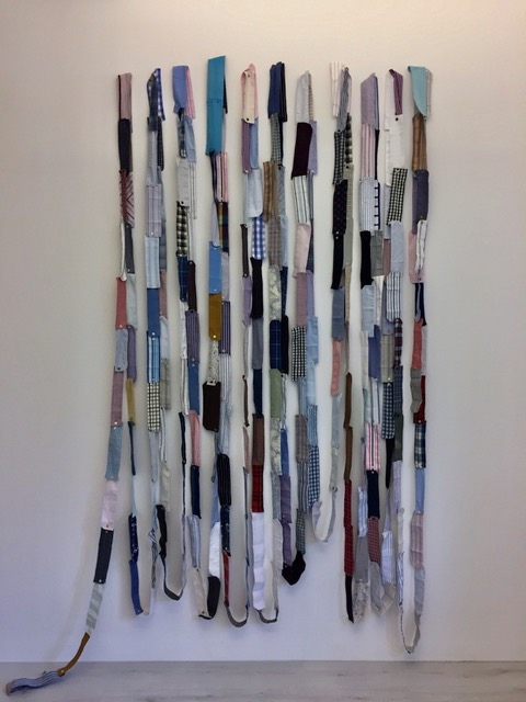 I’ve been following Stuart’s blog for years now, and we have become friends. I even met him in the real world once, in Stockholm, where we greeted each other like long lost family across an open square. (I didn’t run though, that would be unseemly.) Recently he has been using ties and shirts in his work. I won’t presume to describe the reasons, but it’s beautiful work… go look it up! In using these ties in work reminiscent of heraldic shields it occurred to me that it was so “male”… my textile work was so “female”… I’d used bras and children’s clothes and domestic textiles. I said out loud to myself in the studio “Stuart needs these shirt bits!” and I posted off four stuffed parcels to him in Sweden. His first instinct was just to simply connect them by buttoning them together into a long chain and hang them in loops. This very simple act had not occurred to me, because I don’t do that. That buttoning action is not part of my everyday experience. I had been trying to think of a way to use them that required them to be stitched together, to sort of obliterate their former use, whereas Stuart just did with them what came naturally. They look great. He has titled the work Rest. A great word. Implying the left over, and the stillness… the support of one by the rest? Perfect title Stuart! I’m glad I sent them. They have found their appropriate home.