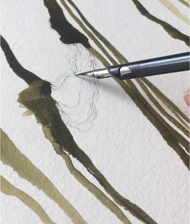 On my table is an A2 sheet of “practice” paper, not so heavy, not so rough. Brush-lines are painted, in mixed inks, using much lighter strokes. The lines drawn on these are with new nibs, a little finer than those I’ve been using, capable of much more delicate lines and traces across the paper.