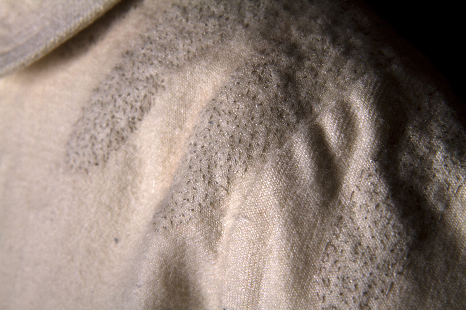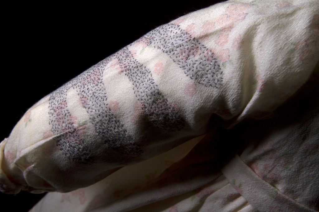 The stitched hands on the children’s clothes made for Are You Listening? (MA show) showed the marks left behind. One person on another: adult upon child.