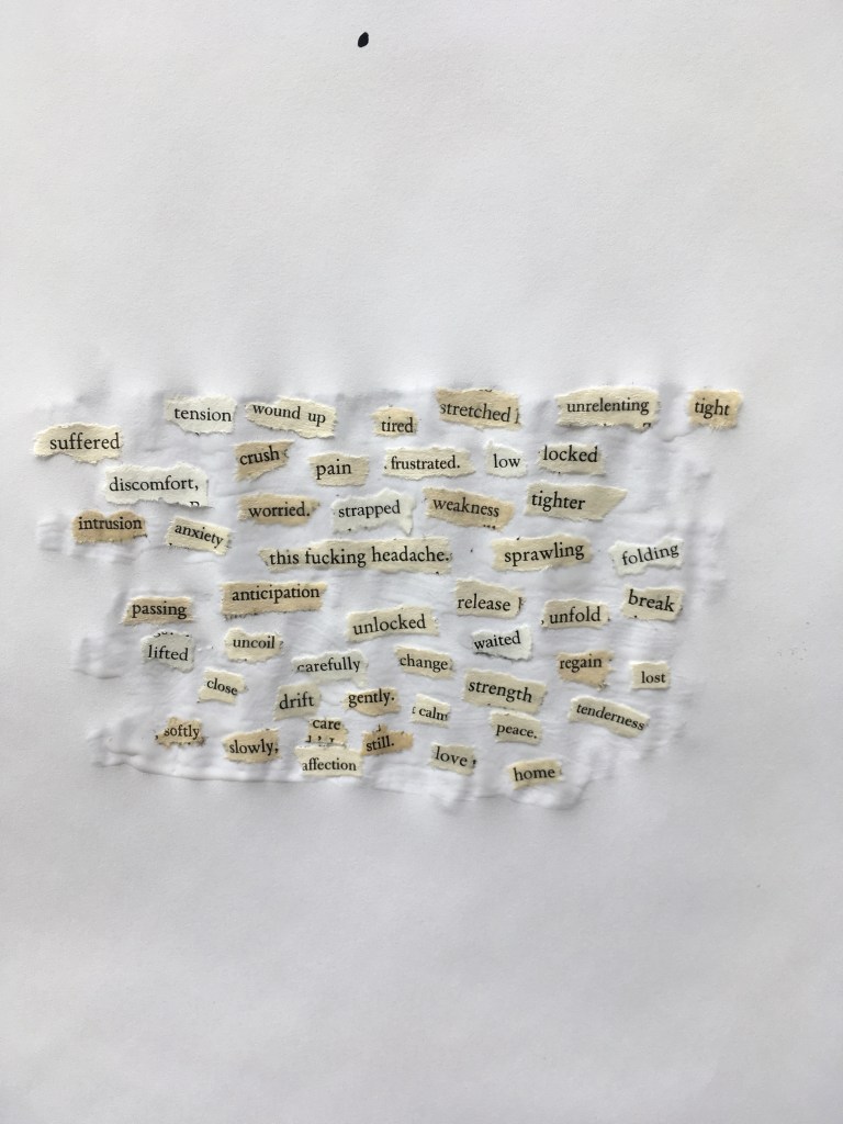 So I put the playlist on shuffle, just to see what random song it would throw at me to start. Alarms. So this was the song to start me drawing? Still feeling unready to make a mark on this huge expanse of paper, I started off by tearing words out of the pages, while listening. I found myself drawn to the negative, naturally, feeling unsettled… but allowed it to happen… then found myself selecting some transitional words that helped steer me out of my mood, and soften my demeanour. I glued them to the paper hanging by my table, and decided I could face the drawing paper. If you have new sketch book freeze, this is a killer! 15 (ish) metres of paper stapled to the wall. But all you need is a spot. The sweet spot from which to venture out with the lines.