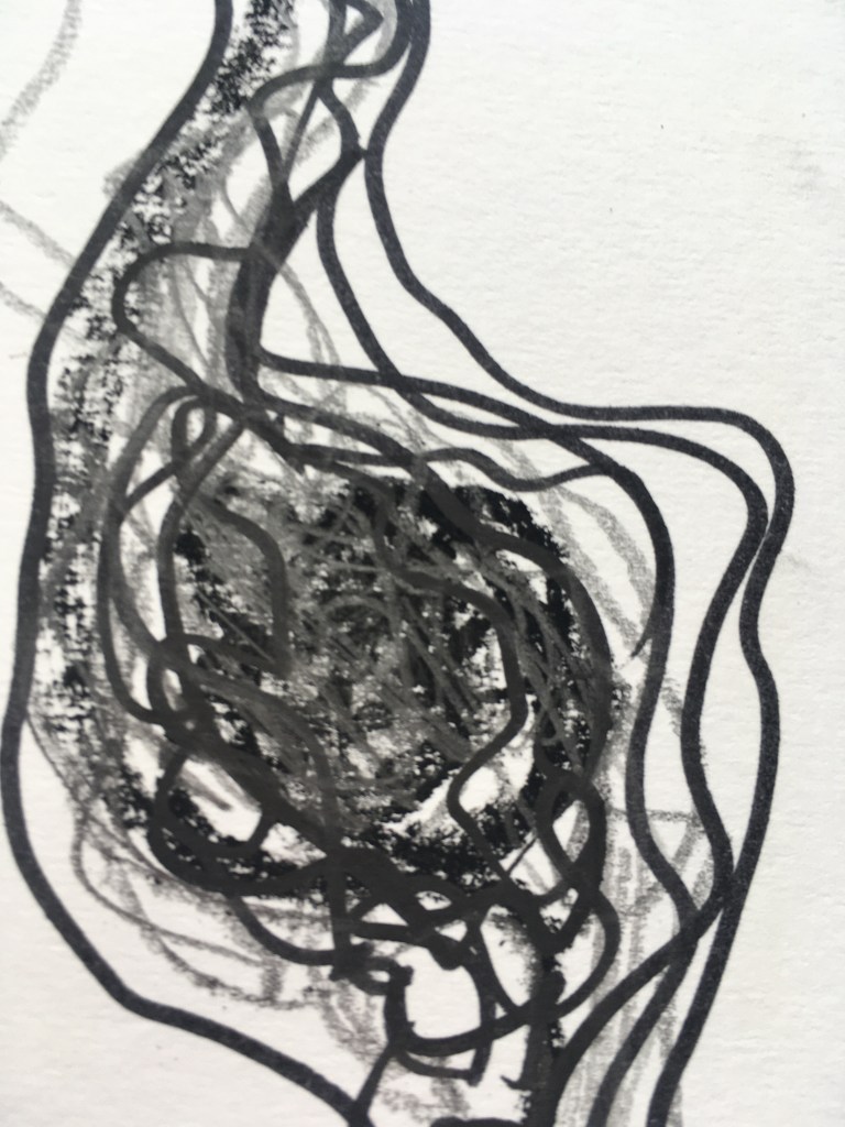 I have planned for this week to be just me, in the big space, with big paper, exploring the music and the drawing. Just that, for a week. A Big Ask as they say. Over breakfast and before I even left the house there were several interruptions to my peaceful, preparatory thoughts. I left the house resentful and bad-tempered. But I determined to start the day as planned. Made tea, of course, in the insulated cup that would keep it hot for longer. Then set to.
