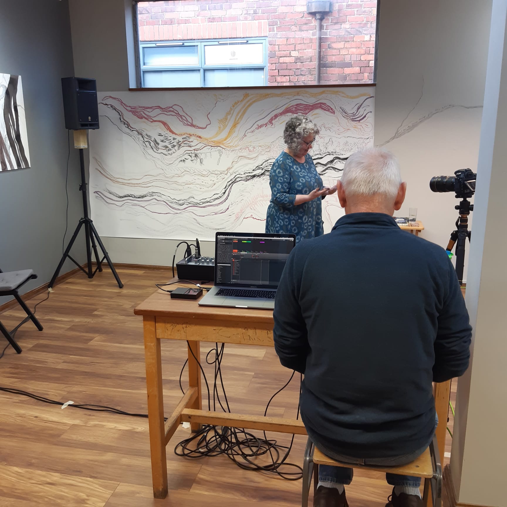 What I am really loving though is the listening. This is how it was supposed to be. The links visual and aural between the lines of ink and the lines of music and lyrics are definitely there. I think yesterday’s event helped fix that for me too. It was a bit of a risk, I’d not done this before… Bill Laybourne and I had had a day drawing and making sounds, but to do this in the gallery with a live audience was very interesting. I think it took about 30/35 minutes, but there were times i zoned out and just drew, unaware of audience, and times when very aware of them, when a sound made me laugh and they laughed too… connection… Bill playing… and making me giggle. It felt appropriate, because I like to find laughter in amongst all this. Too serious is not good, it makes me think that people will think I take myself too seriously, that pompous thing is a real turn off!
