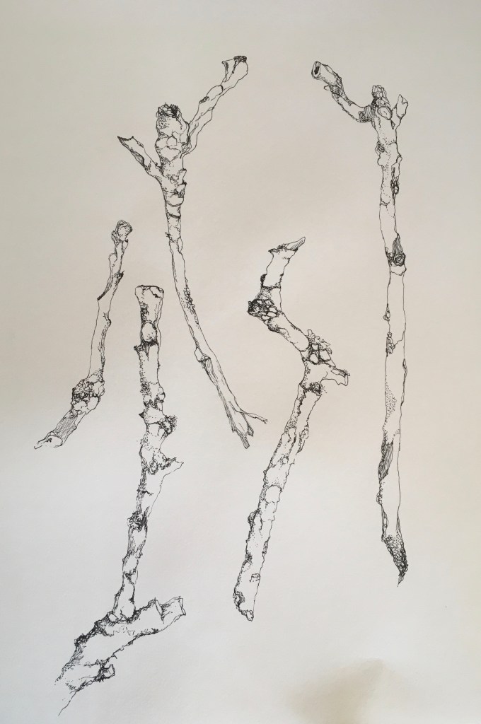 But now, as I said, I start to twitch and need to get back into the swing of things, occupy my neglected studio, just start doing again. In the absence of a clear focus (which is absolutely fine) I need to just exercise the muscles again for a while. I’ve been doing some observational drawings of some beautiful knobbly gnarly twigs with lichen on, and they’ve really satisfied an itch to draw with purpose. I’ve also signed up for one of Sarah Goudie’s drawing sessions at the end of the month. This offers the opportunity to let go of the reins, and explore in a different way. It also offers the opportunity for conversation, and small collaborations. I will use this session also as a brain and muscle strengthening.