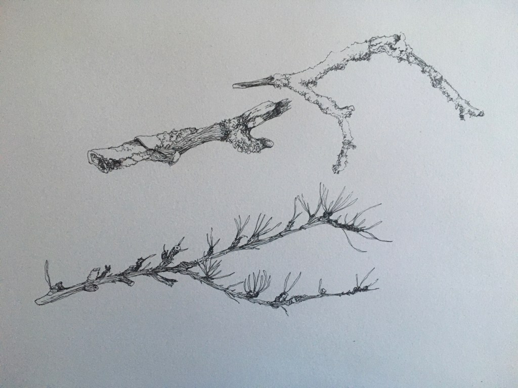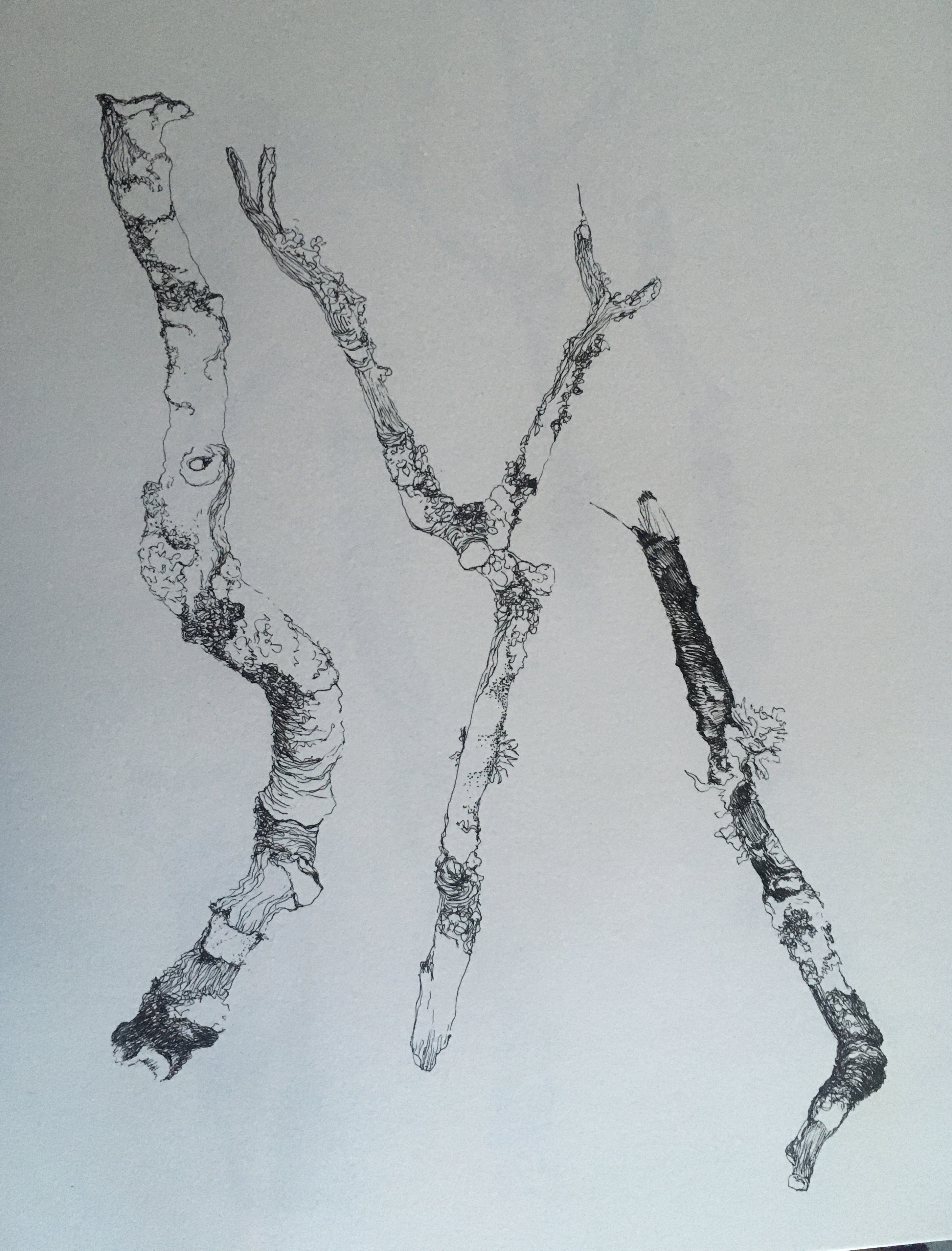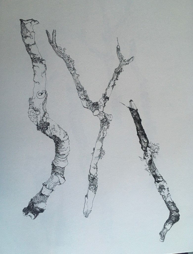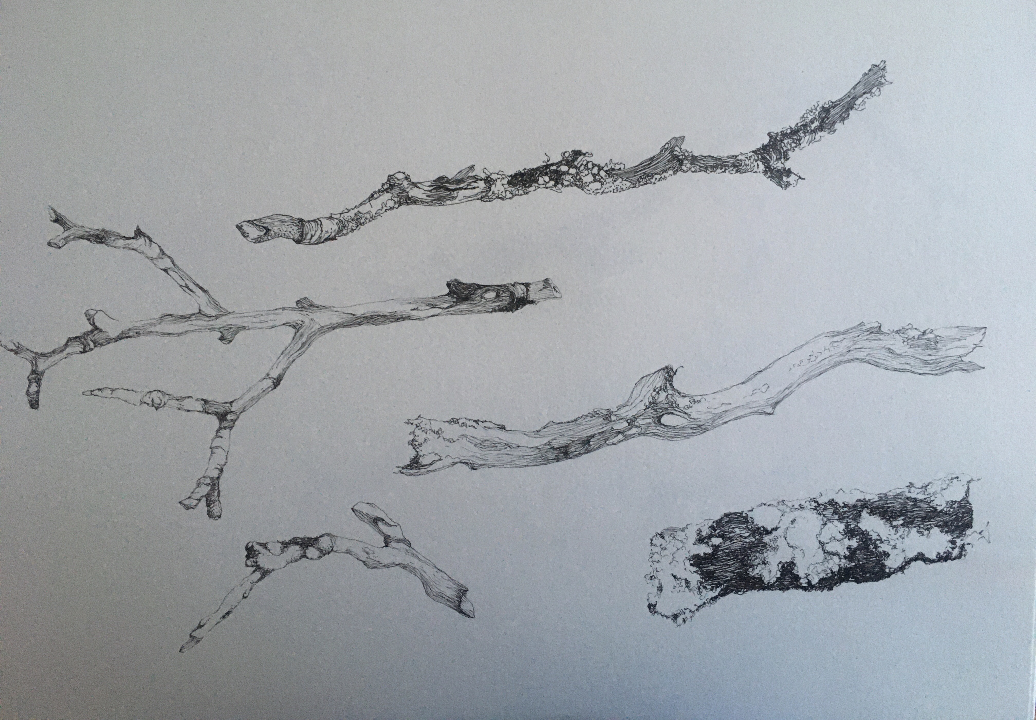 I am doing some old fashioned observational drawings. I had originally intended to draw all sorts of natural forms: sea shells, leaves, feathers, flowers… but I seem to have got stuck at twigs (nearly but not quite a pun).