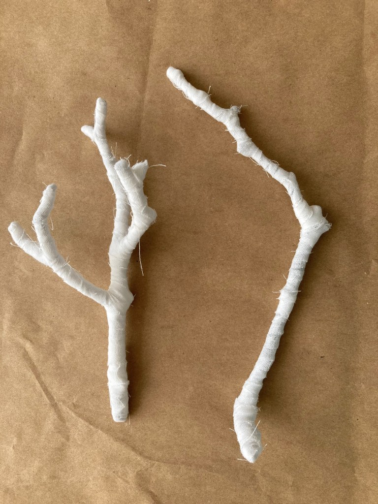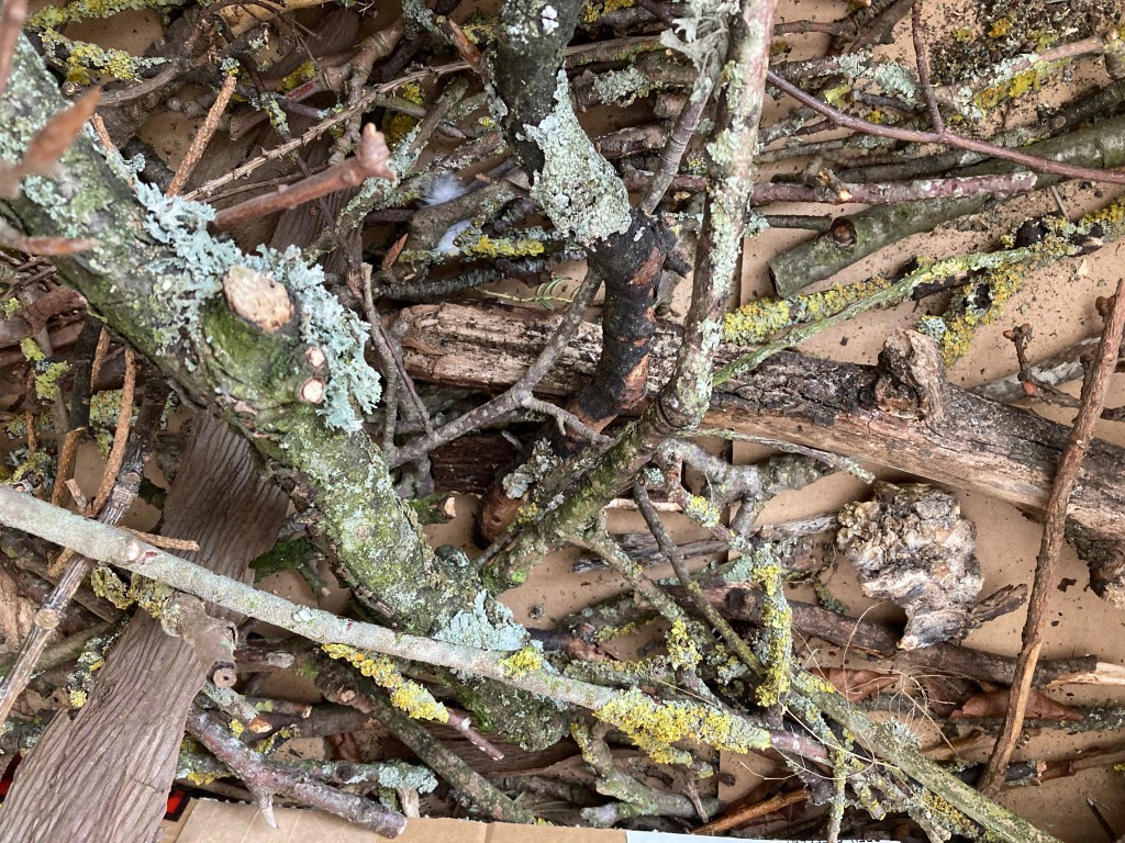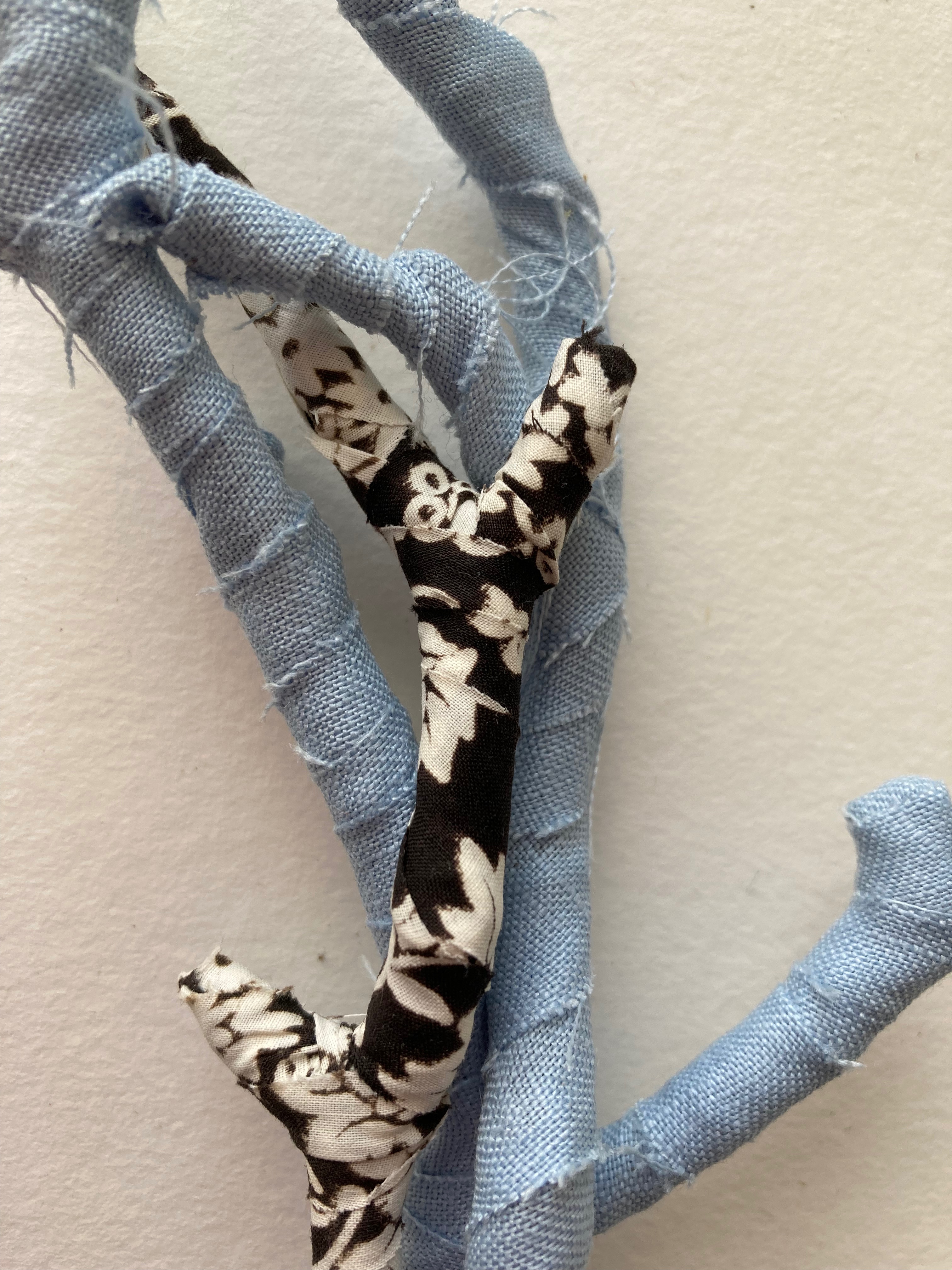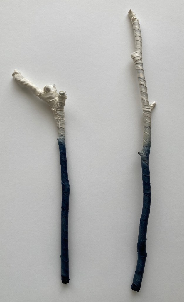 I think the wrapping is interesting, particularly. The fragility and brittleness of the dry winter twigs and their crumbling lichens finds a place in my heart. Metaphor is strong in me, I always search for the analogy and the “what if this was like this?” “What if this twig was like this person?” Our elderly neighbour has recently moved into residential care, and we watch as his family remove his beloved and well sharpened and oiled woodworking tools and dismantle his workshop and the collection of Very Useful Items from his garage. I find a bent and brittle twig and wrap him up. I see families ripped from their homes in Ukraine by fire. So I collect the family of twigs and wrap them up in blue and lay them straight.
