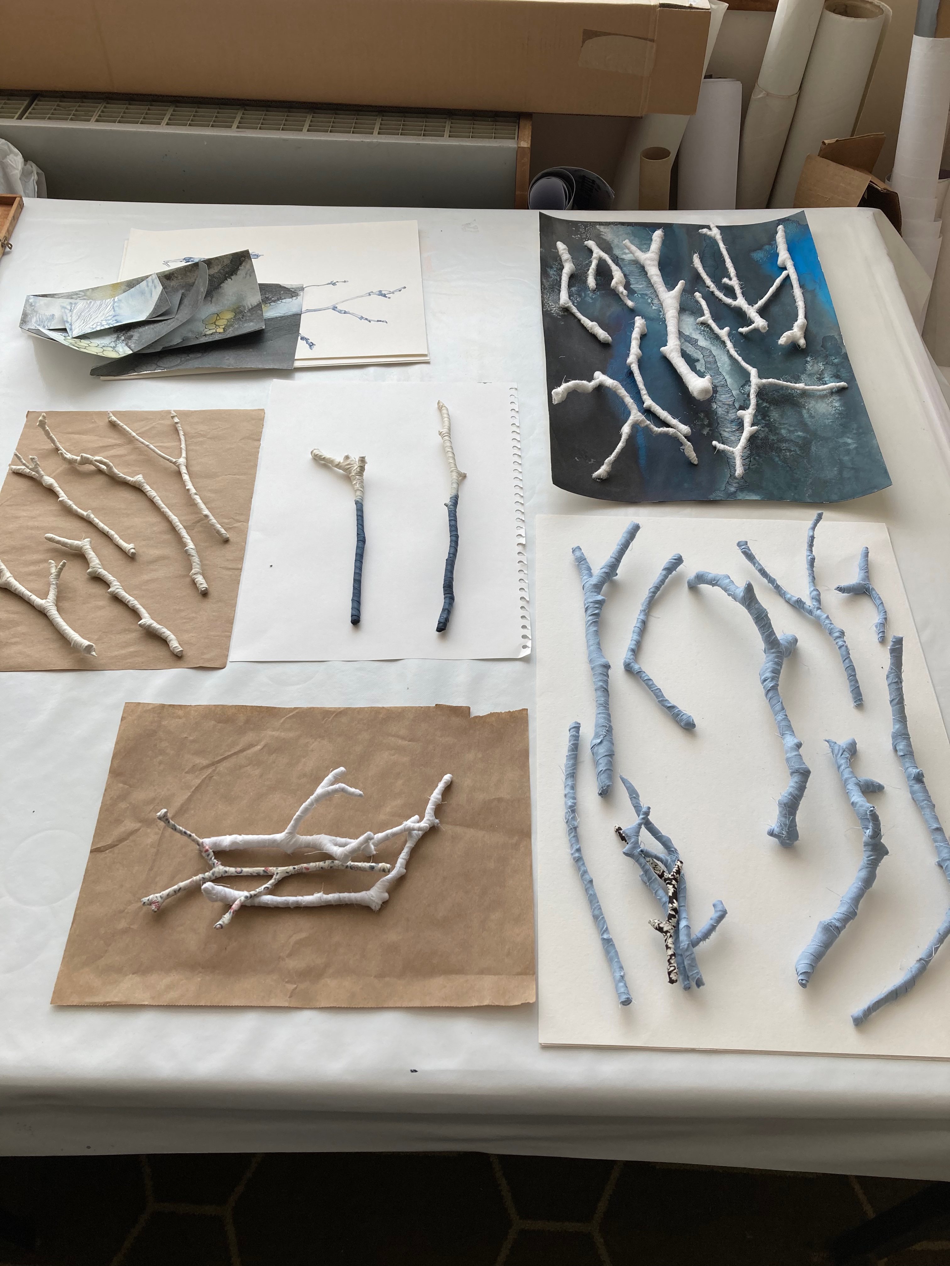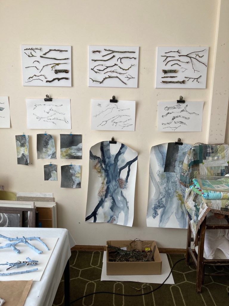 To totally surround yourself with something and work with nothing but that. For me at the moment it is the ever increasing pile of twigs. I’ve collected them; arranged them on a range of surfaces; stitched them to canvas; taken photographs of them, drawn them with ink, painted with watercolour; wrapped them in muslin bandaging, white cotton sheeting, blue linen, printed cotton lawn and silk. I’m grouping them in families and trying to find sympathetic collections and arrangements. They are in groups of five/six/seven… then in groups of three: parents and child.