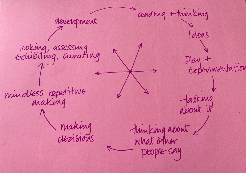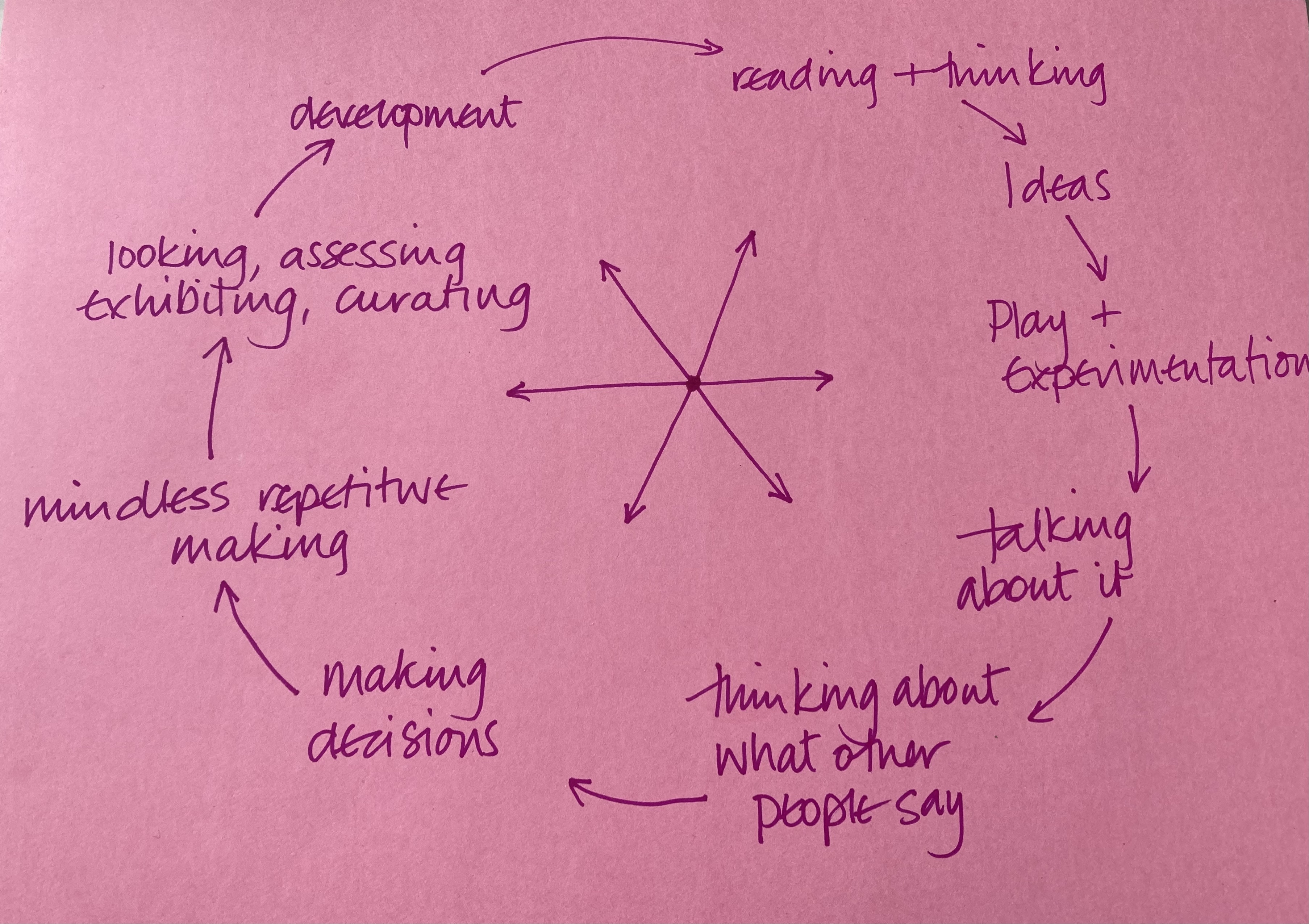 I’ve drawn a cyclical diagram, but the point I am going to jump into that cycle to explain what is going on, is the bit where I am hanging finished work, because every end holds a beginning right?