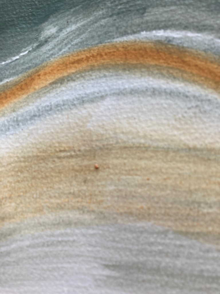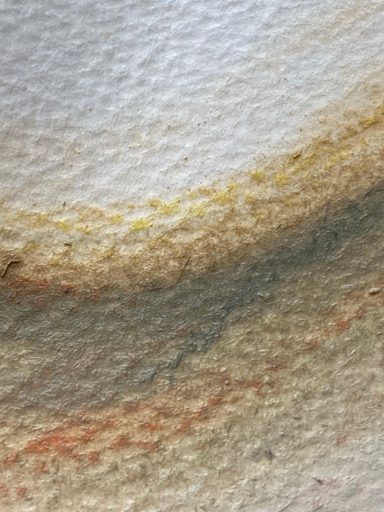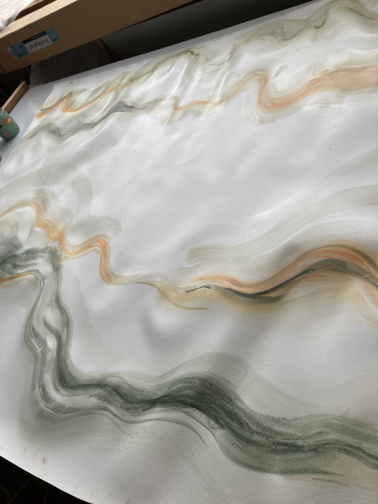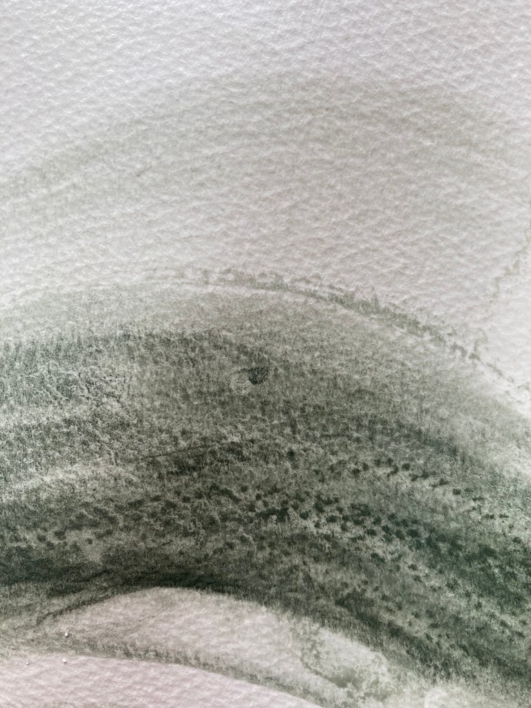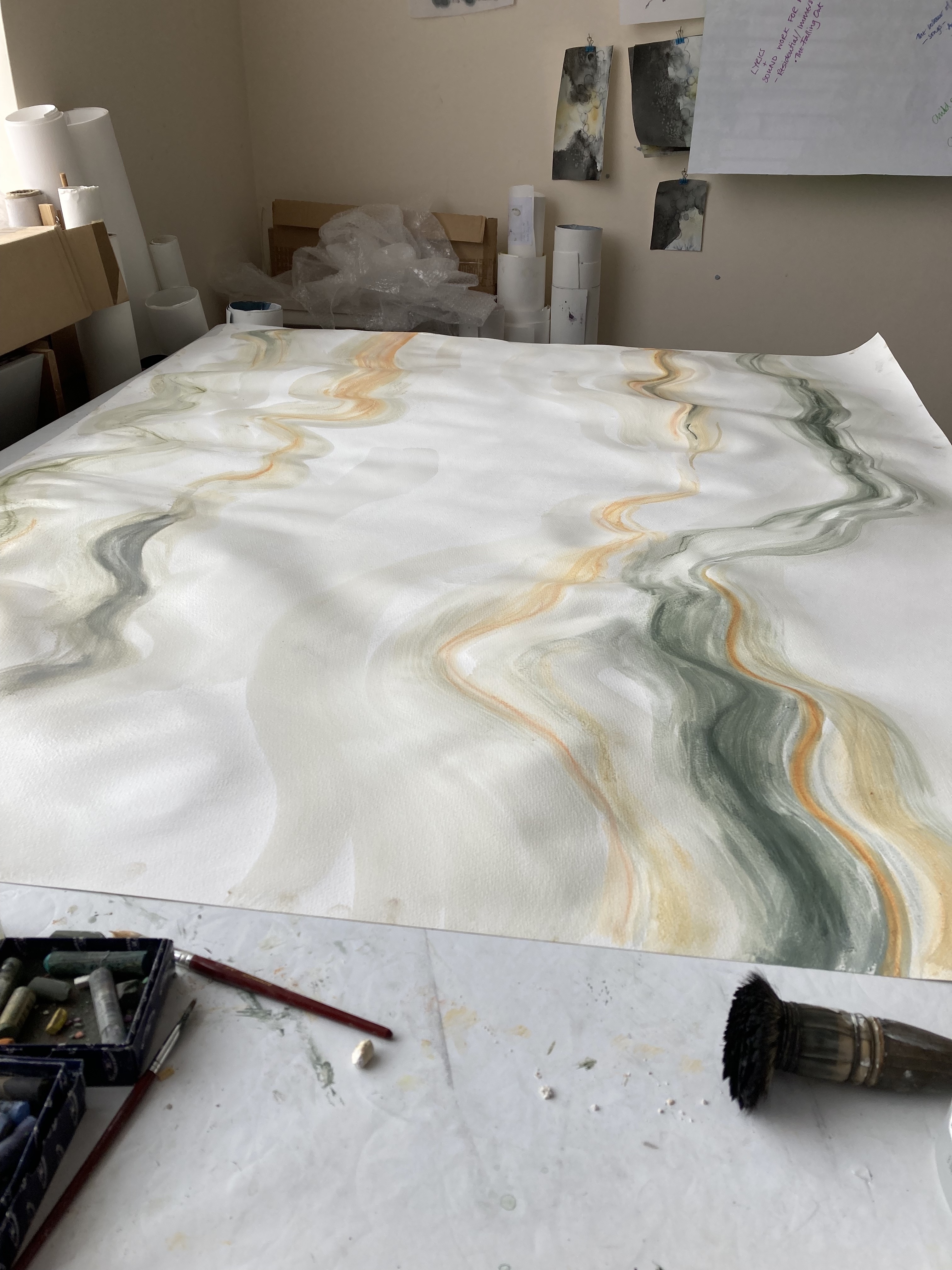 Having slept better than ever on Sunday night, and Monday night, and after having extra top-up naps, this morning I felt the need to visit the studio. Having spent the week inside my head, I felt a great need to draw, large, arms reaching, making marks as far away as I could. And so that is what I did, I only lasted about three hours, but I spent it making large marks on large paper. I used coloured soft pastels on watercolour paper, then spread them with a little water. The paper is crumpled and creased a little, and my marks follow those contours. Next time I will draw over them, probably in ink.