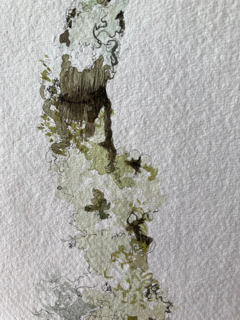 Suddenly I can start to see the drawing on the scarily large paper… something rooted, or something rootless? A disembodied twig, crunched underfoot? Or one that is still pliable, attached to its tree, in bud, leaf, flower…?