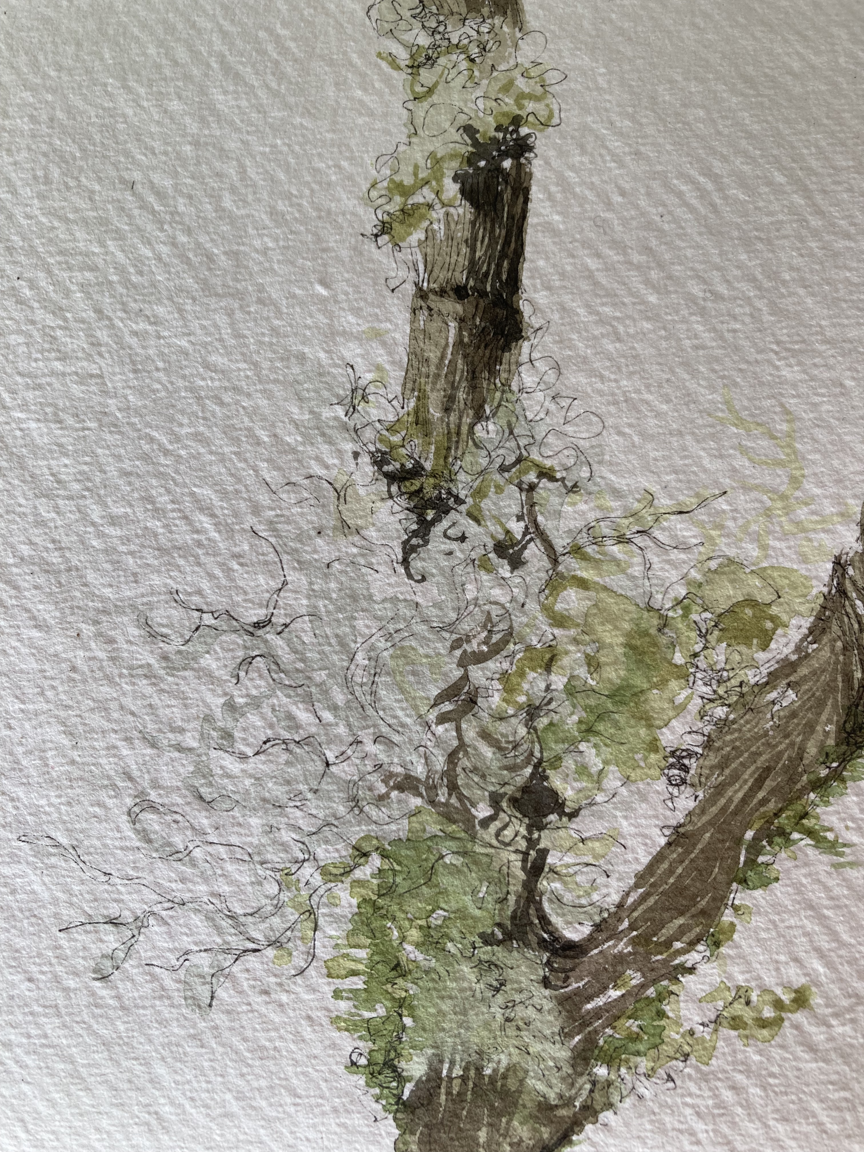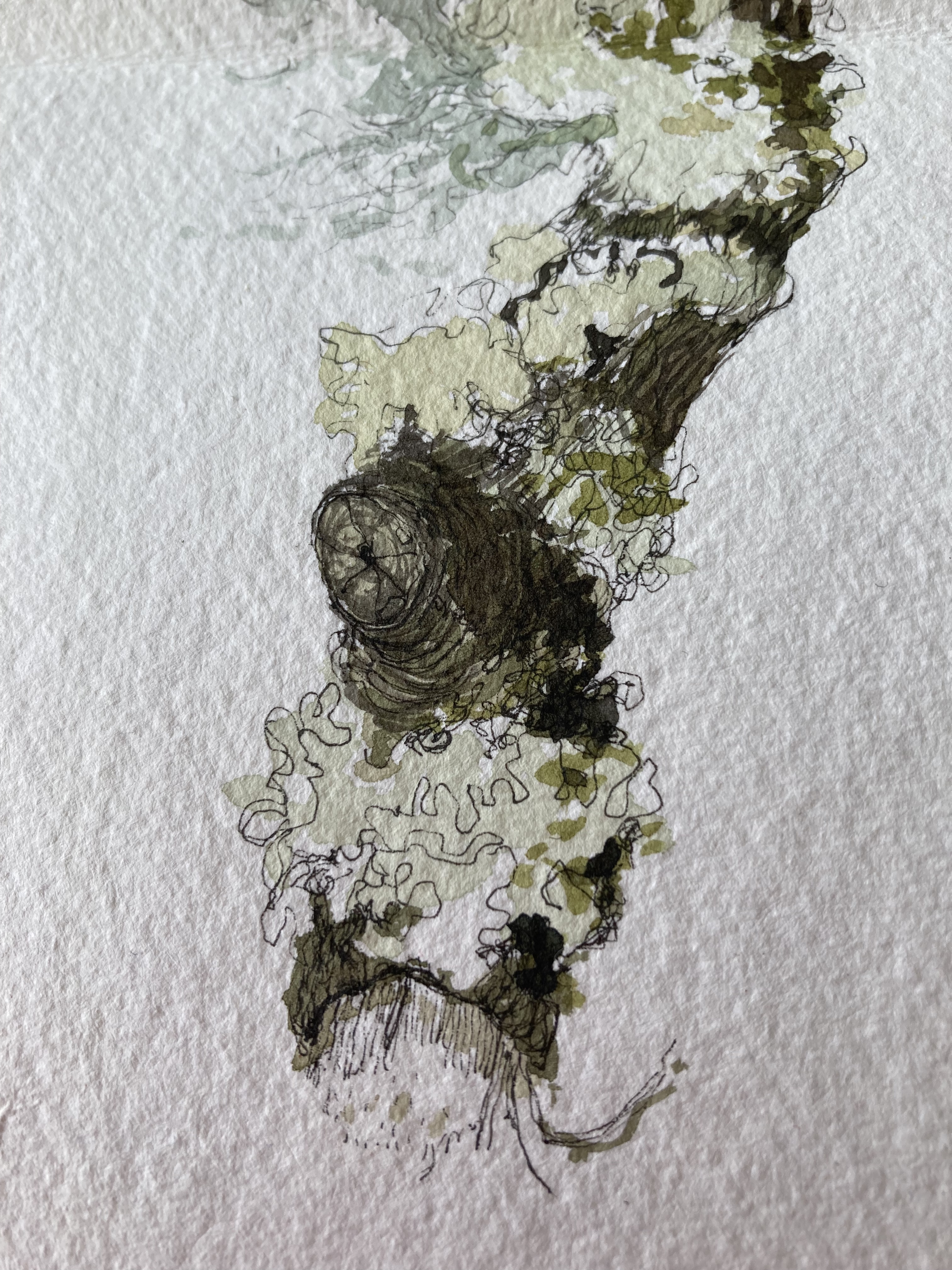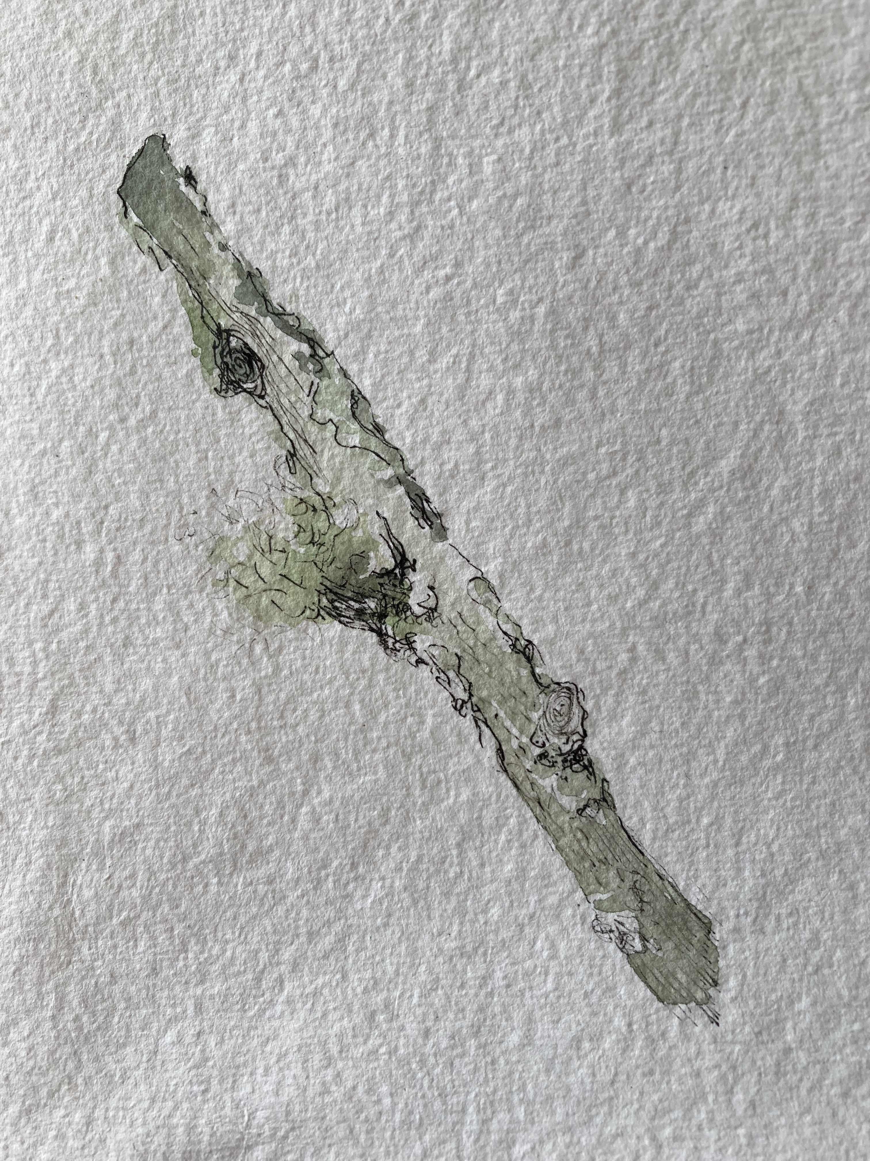 Suddenly I can start to see the drawing on the scarily large paper… something rooted, or something rootless? A disembodied twig, crunched underfoot? Or one that is still pliable, attached to its tree, in bud, leaf, flower…?
