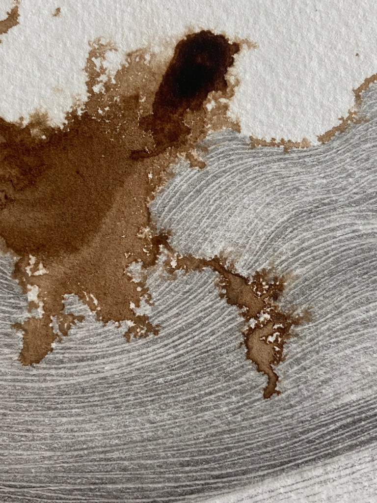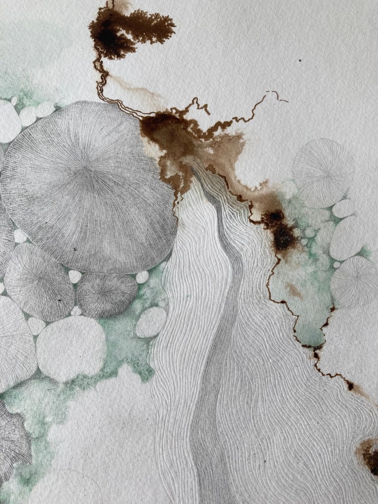 I initially observe, then after much observation, I find the elements I have observed make their way into the abstraction. Then I stop observing, and allow those elements to bed themselves in. Then comes a period of repetition. After a lot of repletion and experimentation into materials, line, colour and so on, changes occur… a moment of mutation… where suddenly the drawing looks weird. Like a word does when you write it out lots of times and forget how to spell it.
