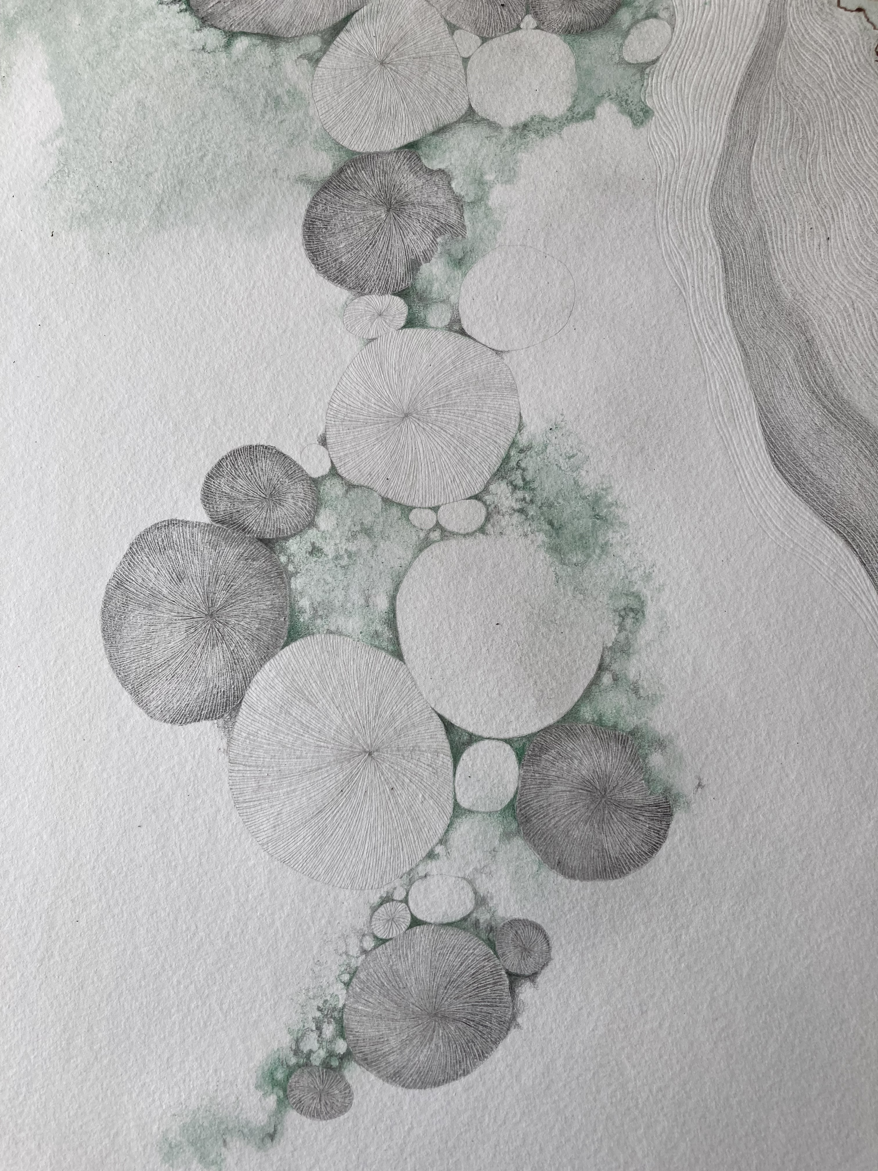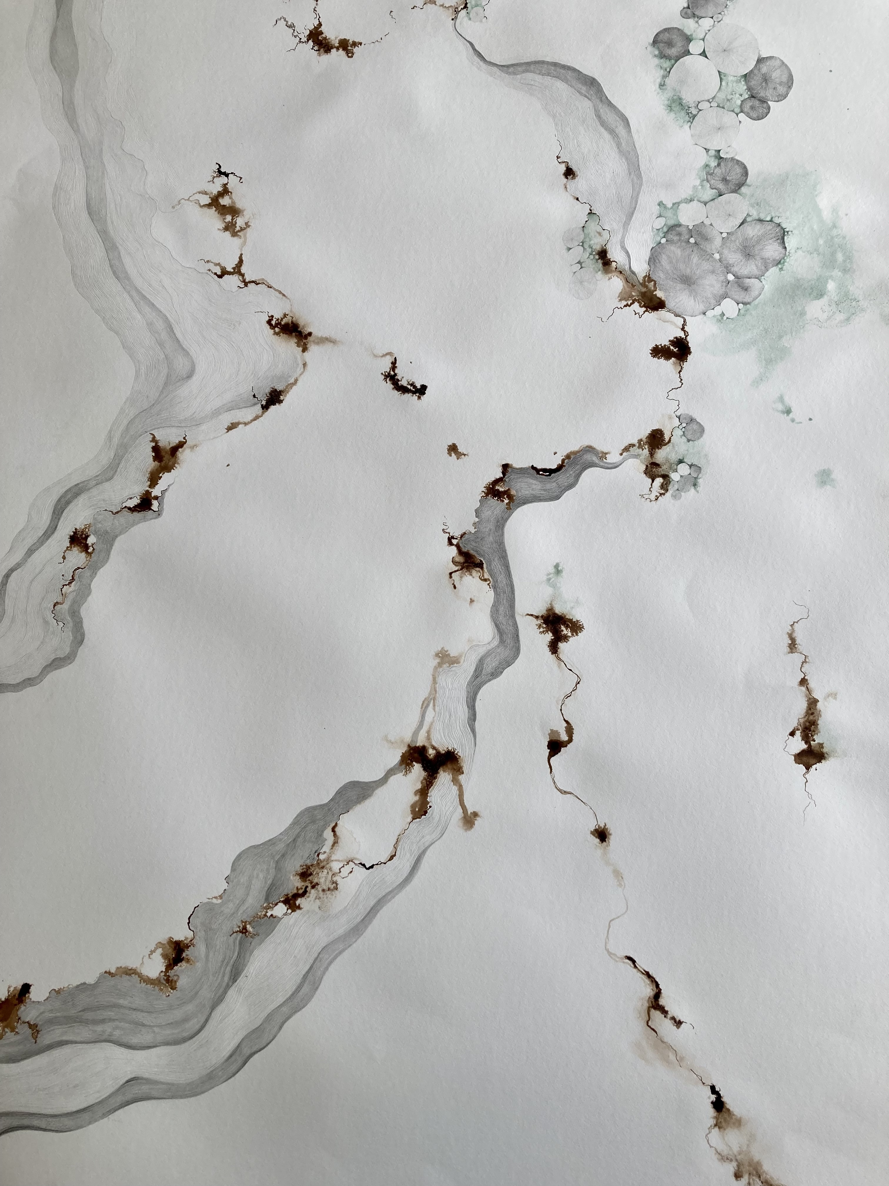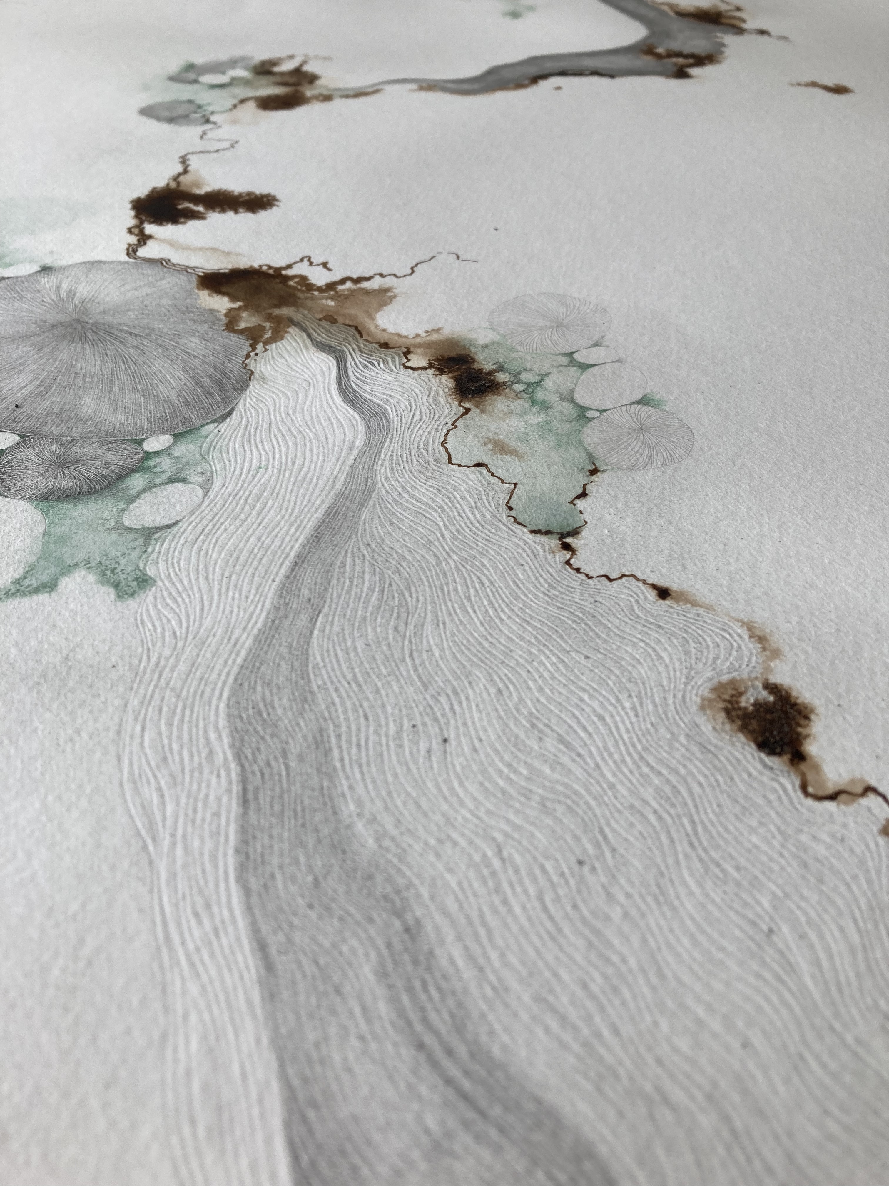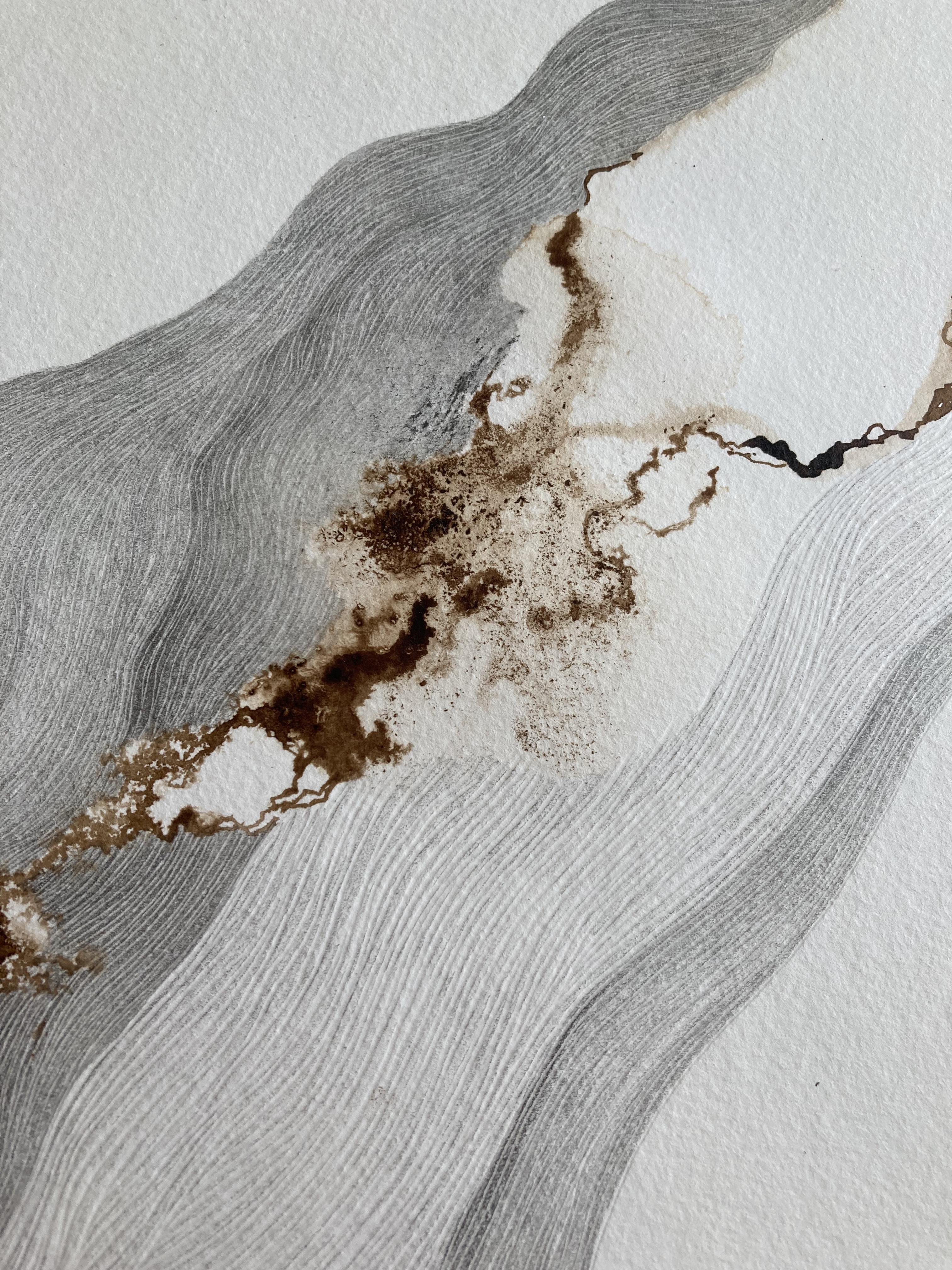 I initially observe, then after much observation, I find the elements I have observed make their way into the abstraction. Then I stop observing, and allow those elements to bed themselves in. Then comes a period of repetition. After a lot of repletion and experimentation into materials, line, colour and so on, changes occur… a moment of mutation… where suddenly the drawing looks weird. Like a word does when you write it out lots of times and forget how to spell it.