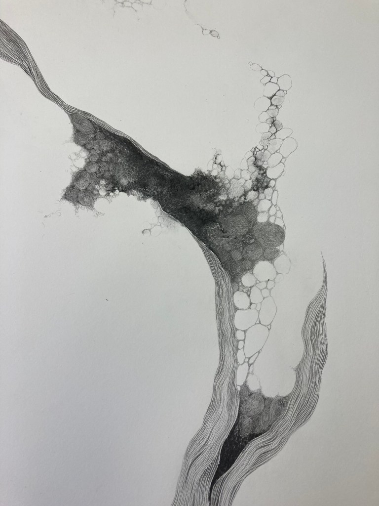 Real life interferes with my train of thought and it would be easy to resent that. I’m obsessed with my latest drawing. The mutation I wrote about in the previous post is continuing. Another injection of a new material, in this case charcoal, and I’m riveted and finding it hard to leave the studio. Now charcoal isn’t a thing I usually go for. It’s not clean enough… but I wanted a particular depth of black, and I wanted to be able to work into it and over it. So I put it down where I needed it to be, immobilised it with layers of fixative, washed my hands and carried on working. What I get from that dull, dense, deep blackness is the ability to polish over some of it with the sheen of the graphite. I’m also able to press into the blackness and pick up the texture with the silveriness… delicious.