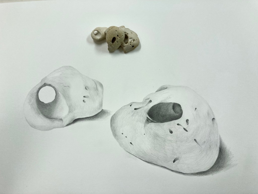 So today, once my new stock of giant paper arrives, (hurry up FedEx) I shall head into the studio and continue the drawing of the stones I swapped at Kate Murdoch’s 10×10 installation. I am enjoying the close observational drawing of these natural objects. Following on from the twigs, this seems a natural progression. The childhood nursery rhymes move along from five, six, pick up sticks, to sticks and stones may break my bones but words will never hurt me. This new focus gives me the opportunity to re-introduce the words back into the family.