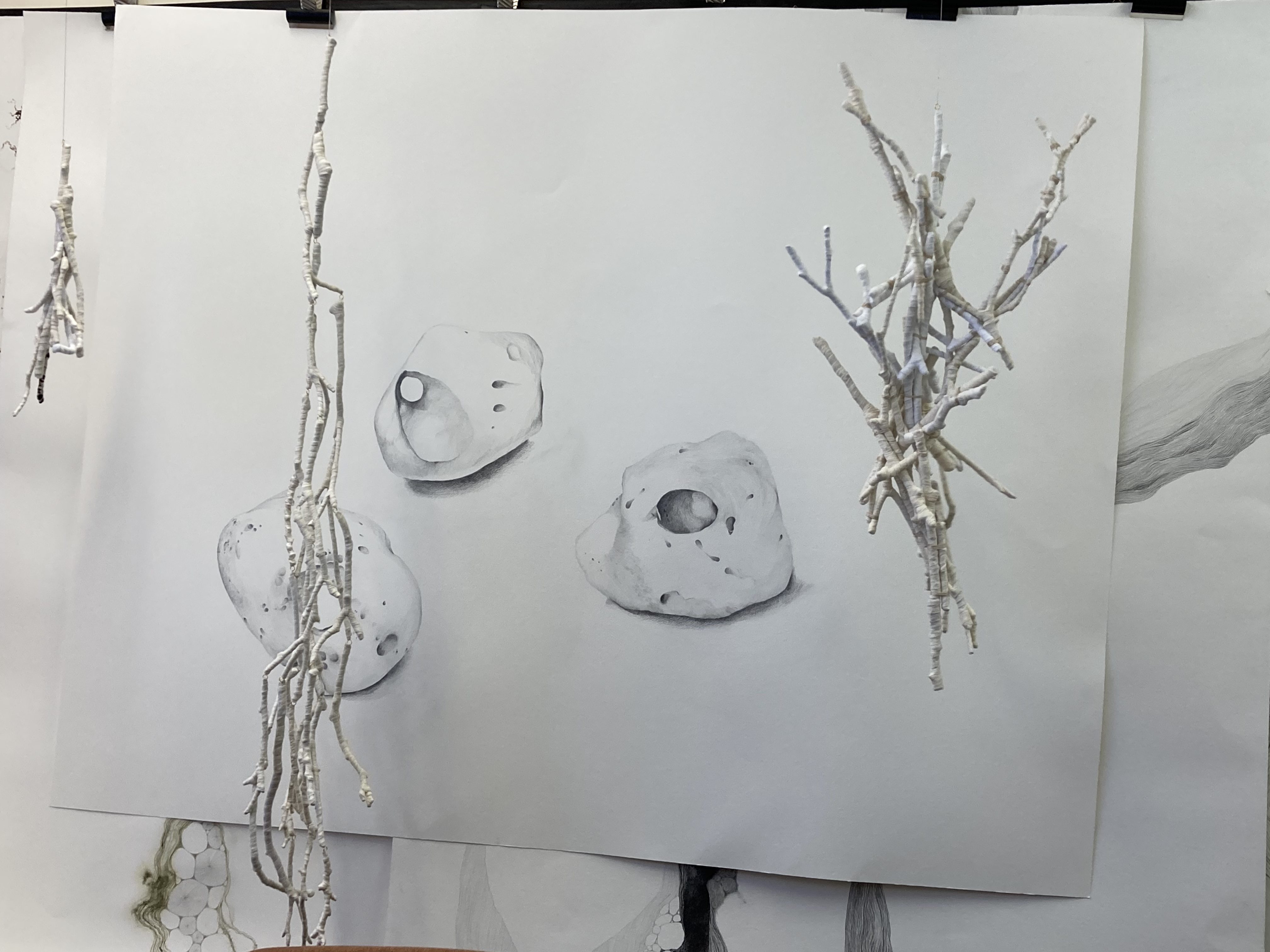 There are many ways to feed the abstraction. The earlier drawings have ended up not looking anything like the sticks I observed, but they held certain qualities of line and marks. These stones are truer to the observed, but as I add more, they become less stone-like, and gain more of the qualities seen in earlier drawings, they are natural, they hint at landscape, at constellations, at cells, at bone and body, they bubble like water…