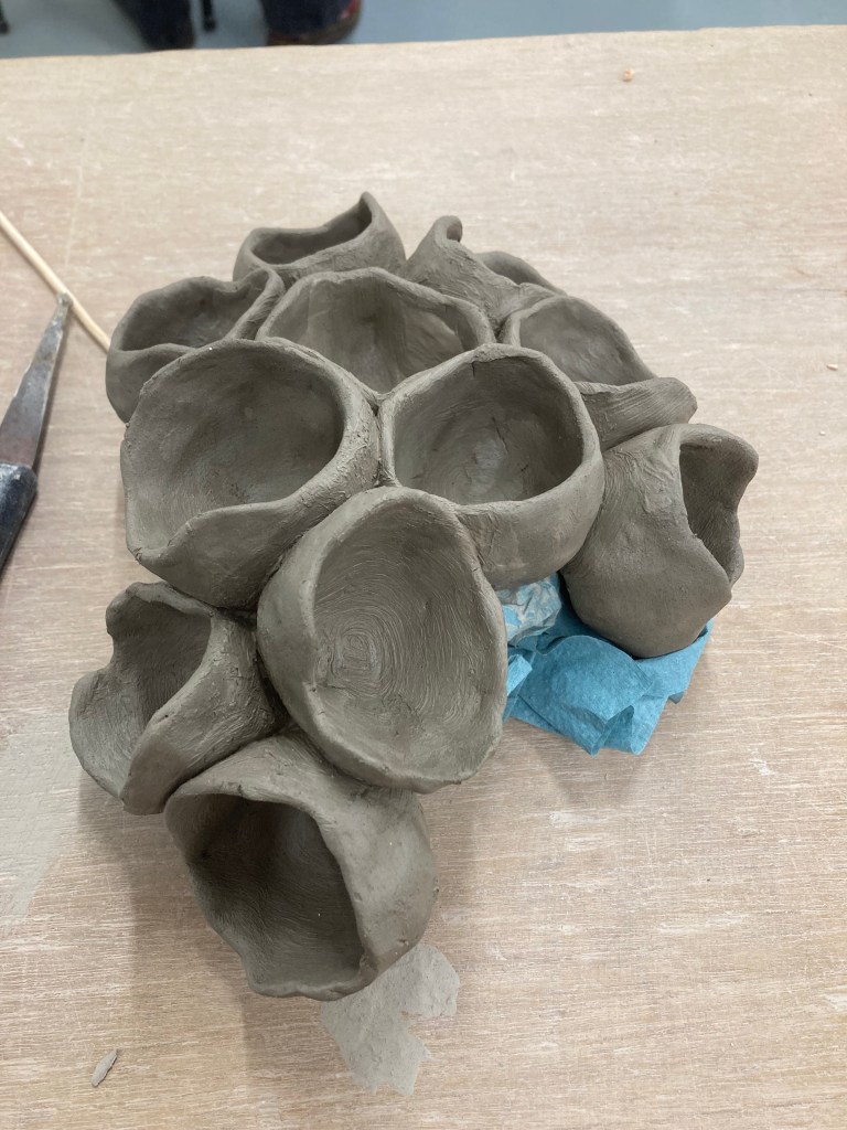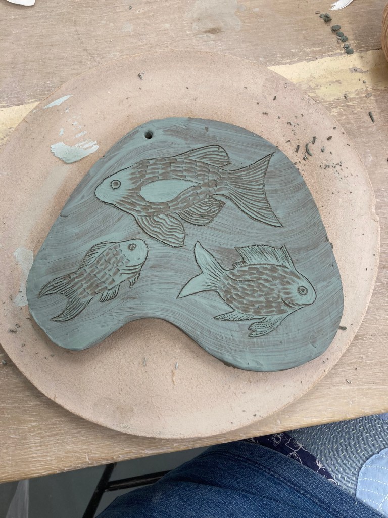 While listening to the lecturer, I found myself “doodling’ with a small piece of clay while she spoke, and suddenly I have a collection of small thumb pots, connected like lichen cups. I cannot escape them! Last week I rolled out a piece of clay in order to try some sgraffito this week. I had no ideas in mind particularly, but having been talking to Bill and Helen about fish, what I ended up with was a freeform flat plaque with fish on it. I let my mind wander wherever it wants, try to give it completely free reign, and dammit it barely leaves the back yard!