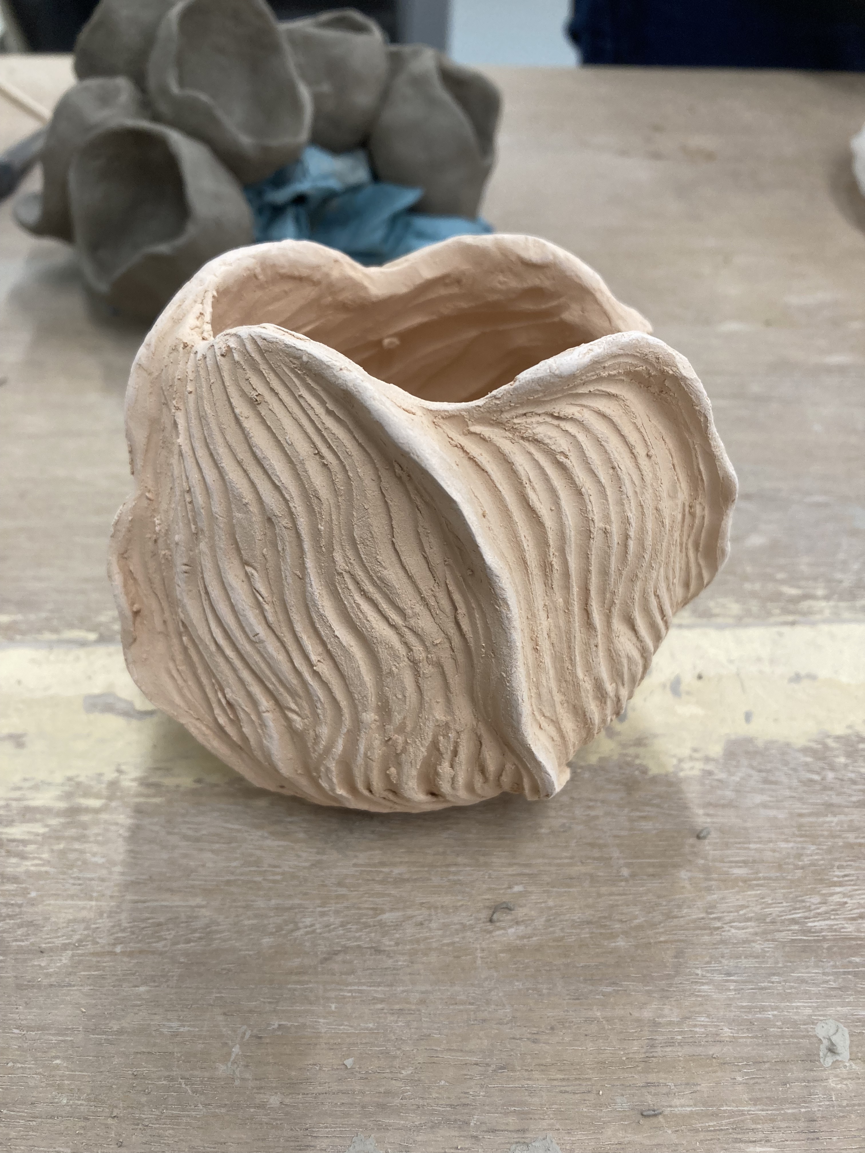 The first coil pot we made, Moira said to me “It looks like one of your drawings, the same lines!” And she is right. I suppose my hands just naturally move in a certain way, whether I’m just moulding the clay with my fingers, or using tools, the same forms appear. Interesting. That pot has now been fired and I find myself thinking how to glaze it so that those lines are emphasised.
