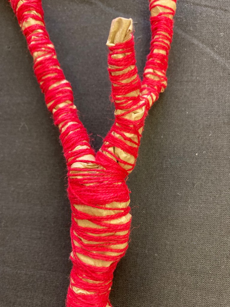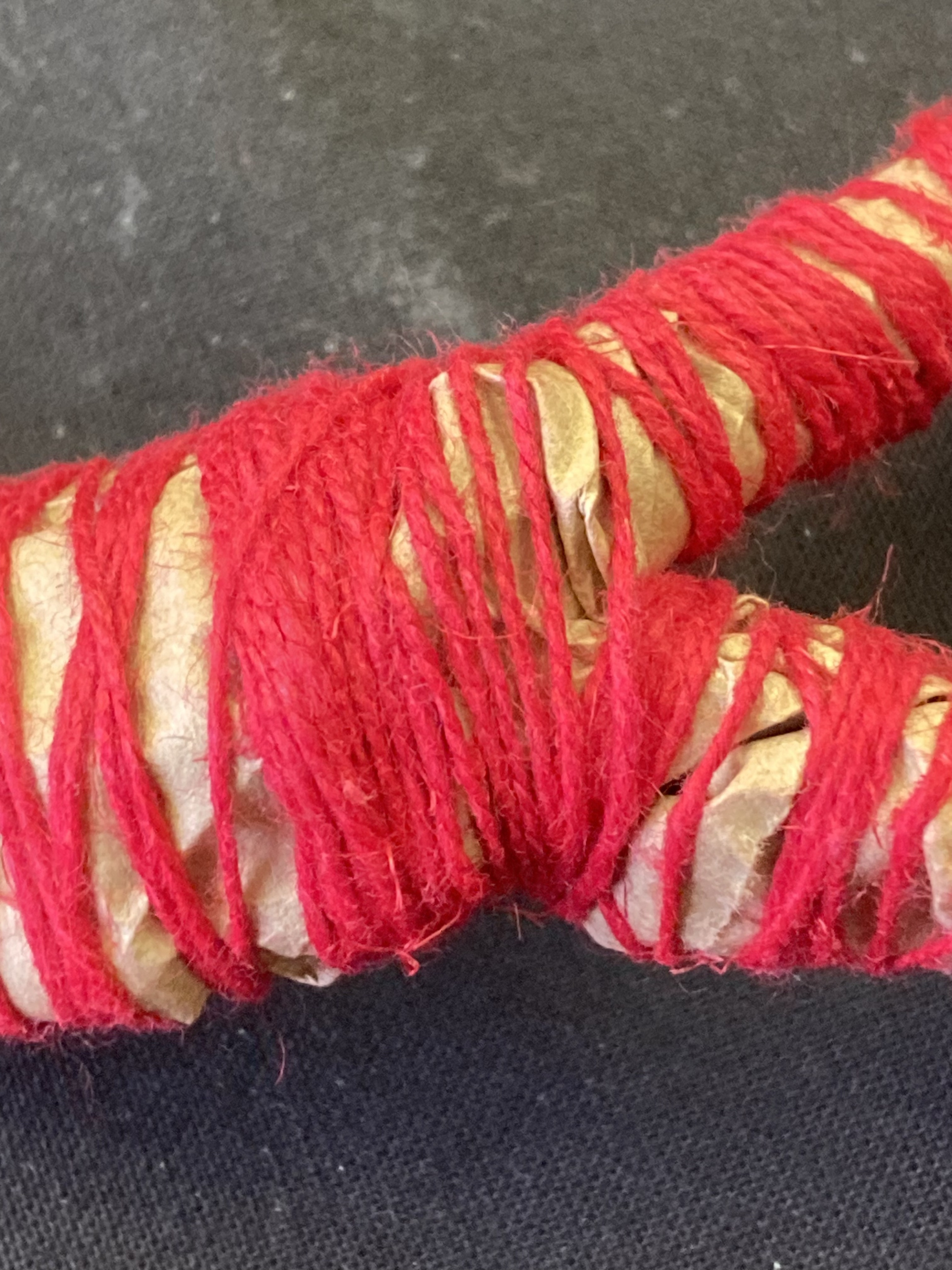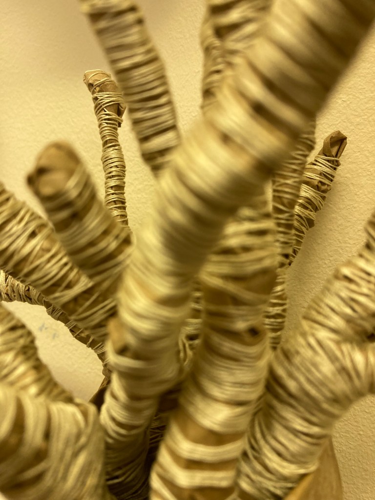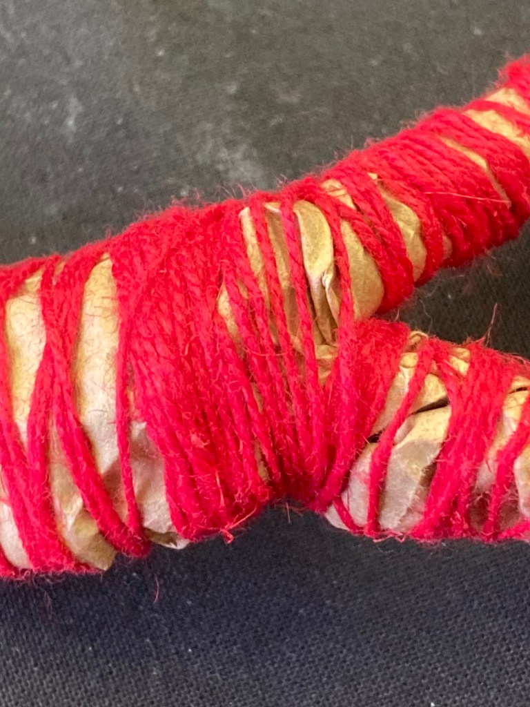 I thought I’d give it a try with the spools of red thread I bought back from Sweden. Now… in terms of semiotics, red thread has different cultural connotations and the field is crowded with meanings I don’t want, so having bound one brown paper twig with red, I don’t really like it. If I had some red waste paper I’d try red on red to see if that makes it different. I think it would. Would I then feel obliged to try different coloured paper with matching bindings? Then I’d have a rainbow of twigs which I’m sure would look very twee, and also hold extra rainbow-associated meanings!