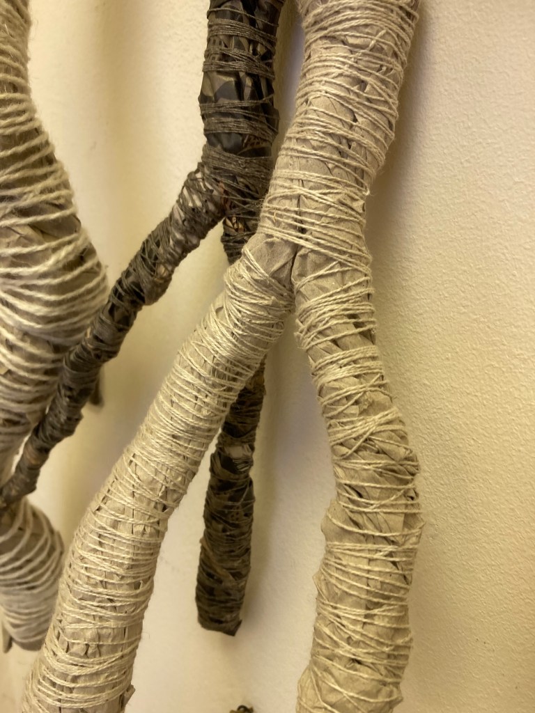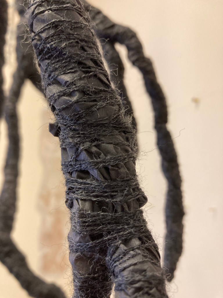 I’m making vessels and twigs at the moment, in a variety of media. The brown paper twigs are placed in brown paper vessels/bags. They are bound with one sort of bleached cotton or linen thread. I have done black twigs with black thread, white with white, but if I try a different colour I’m unhappy with it.