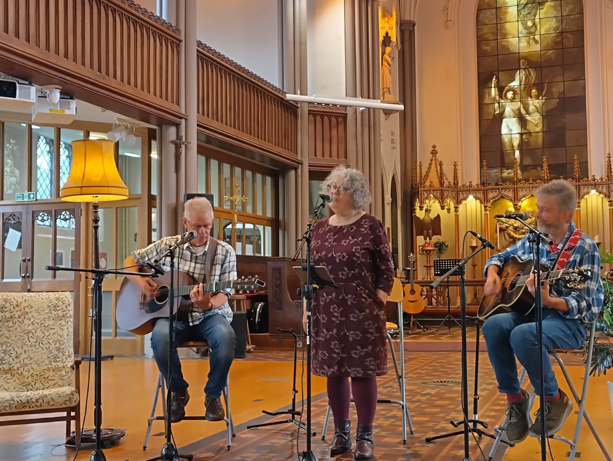 It took place in a large house, in the drawing room (not the sitting room sadly). There were about a dozen people there, in comfy chairs, all furnished with tea and cakes (very delicious cakes too). The programme included a very clever and funny poet, and an unaccompanied folk singer. We did four sets of four songs each, so about twenty minutes each set including the intros and banter, interspersed with the other performers, and a nice long relaxed interval for chatting at half time.