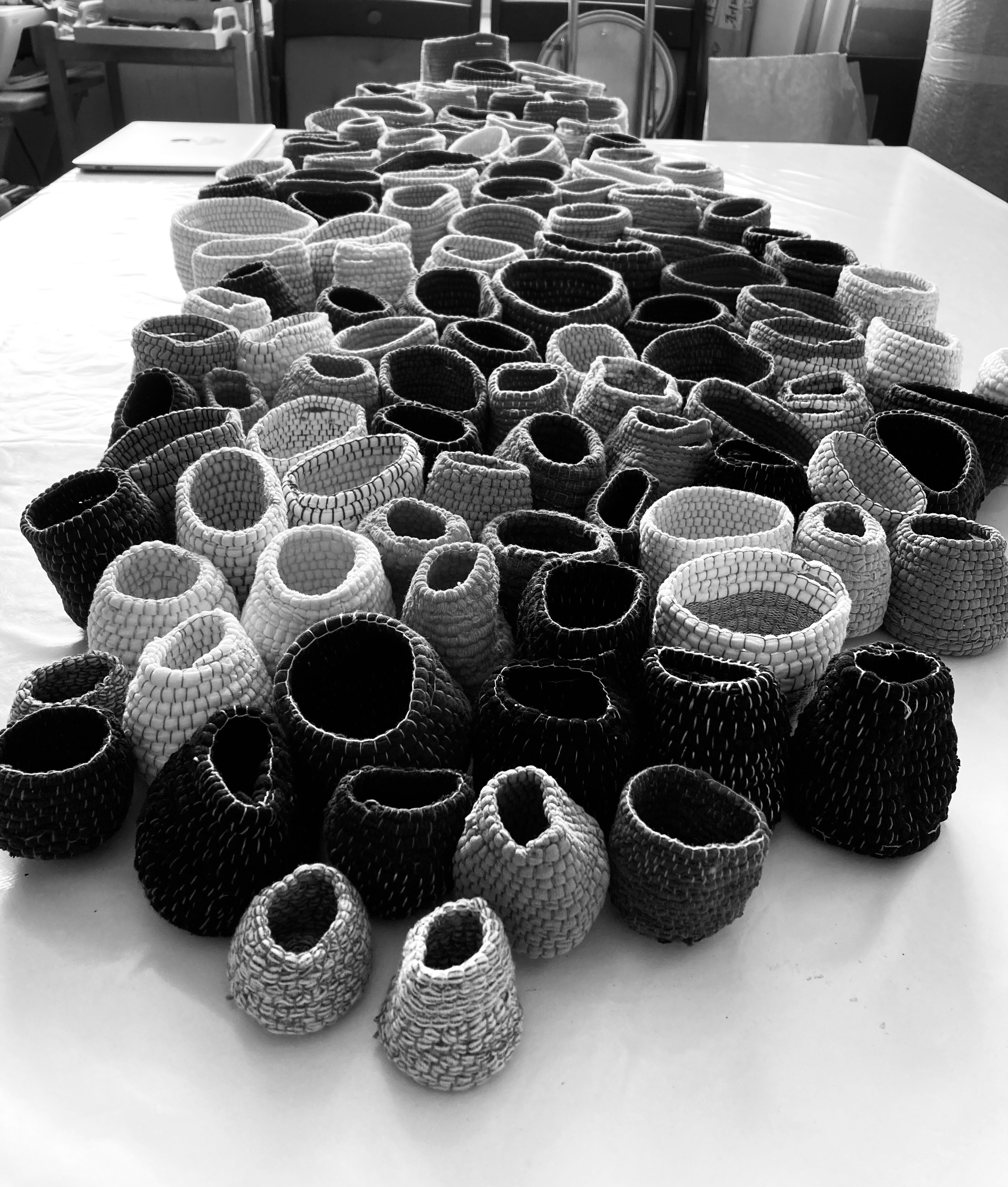Today, I return to the arranged pods and vessels as I left them on the table last time. I want to rearrange them in height order. So I do that while the kettle boils. About half way through the task I know that it won’t be as satisfying, but at the same time I know I will complete this task, take a couple of photos, then start again. I have a thought that a greyscale photo will work better, but it is tonally unsatisfactory, so I jumble them up and start again. (See below).