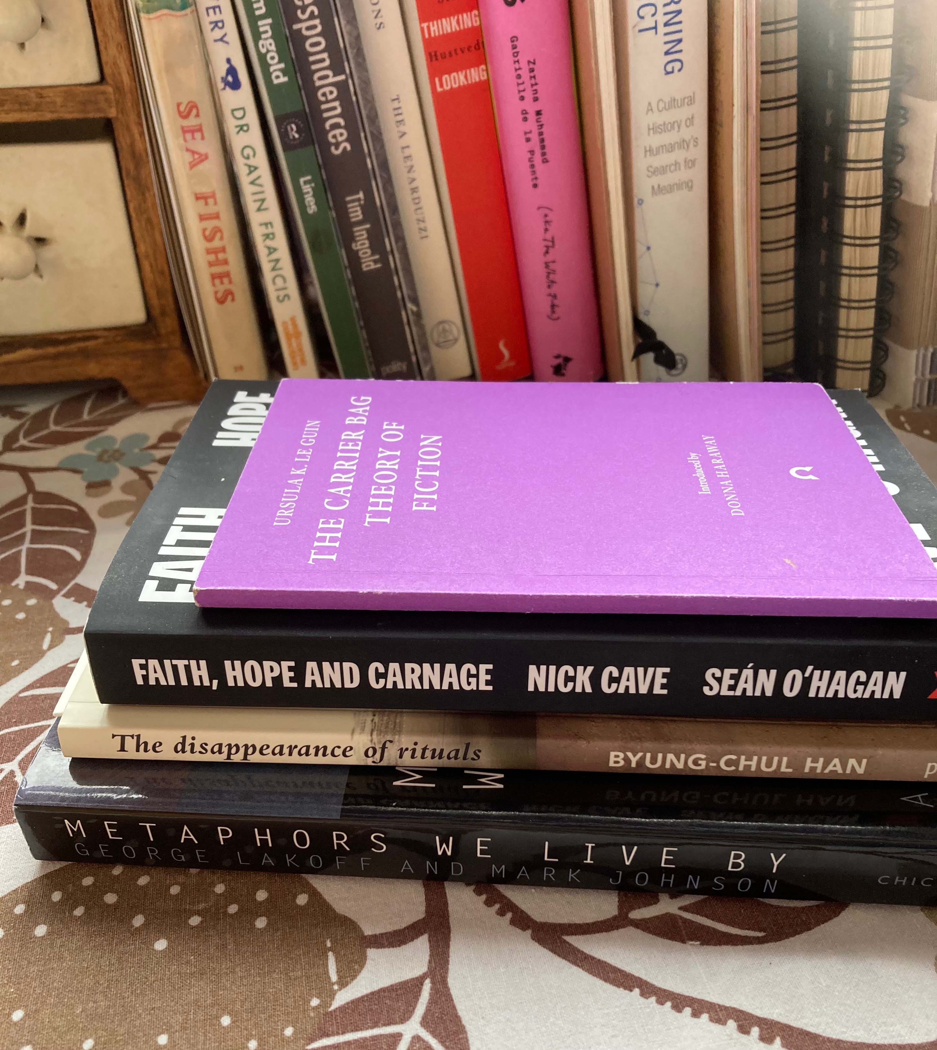 The thrust of my work at the moment seems to be more about words: reading, writing, organising my thoughts. I never seem to be able to finish one book before I start the next. So I end up with a pile that I am dipping in and out of. The advantage of this is that I get a certain amount of cross-pollination between ideas. It is hard to keep track, so as I come across things in each book, I write them on a large bit of paper, with different coloured pens, so that I can draw those connections together. I think at some point I will write something essay-like, or perhaps even sermon-like, and deliver the ideas to an audience… from a pulpit?